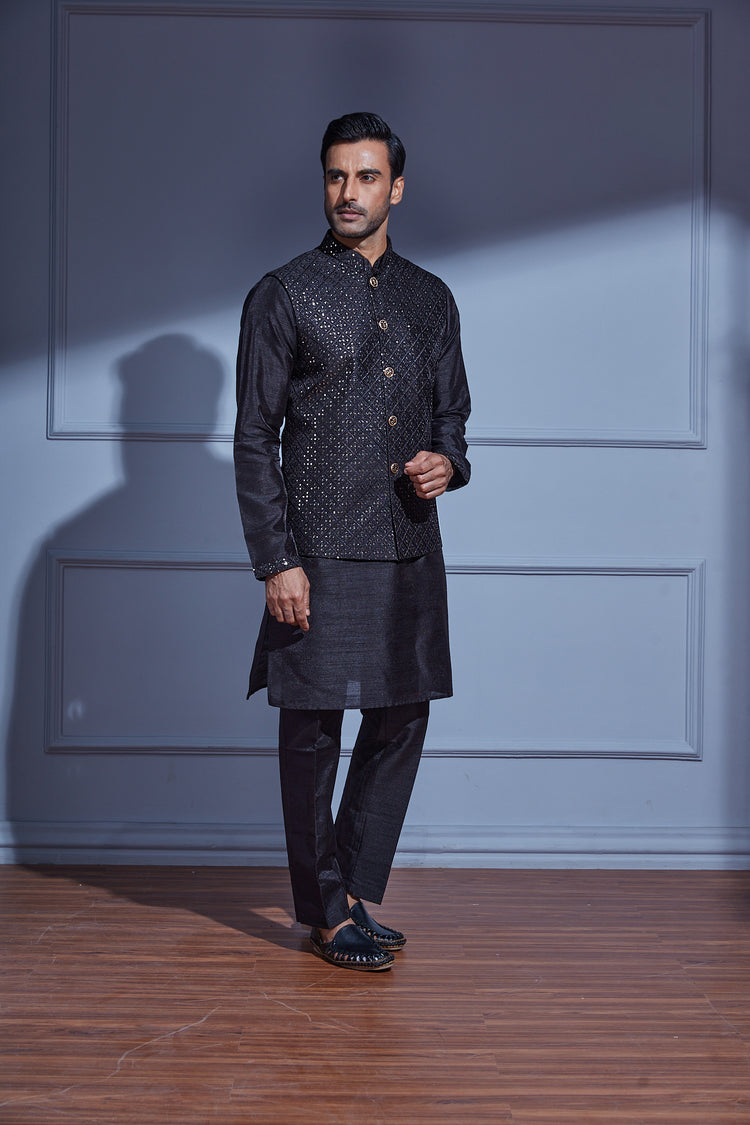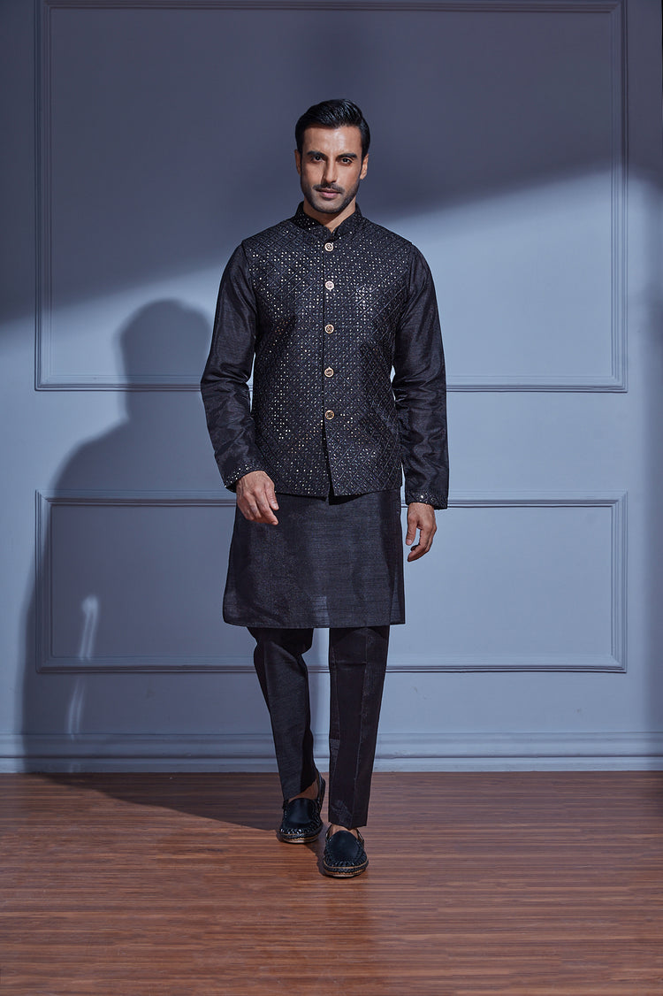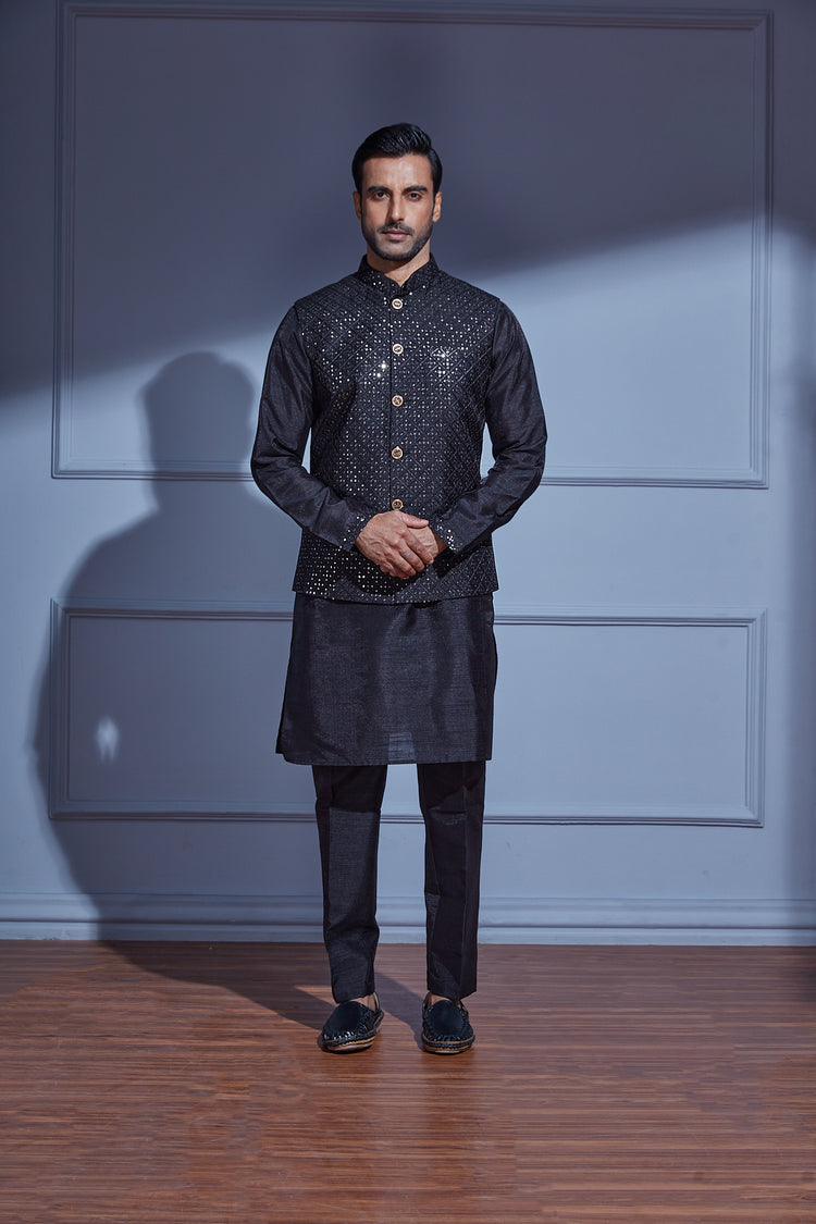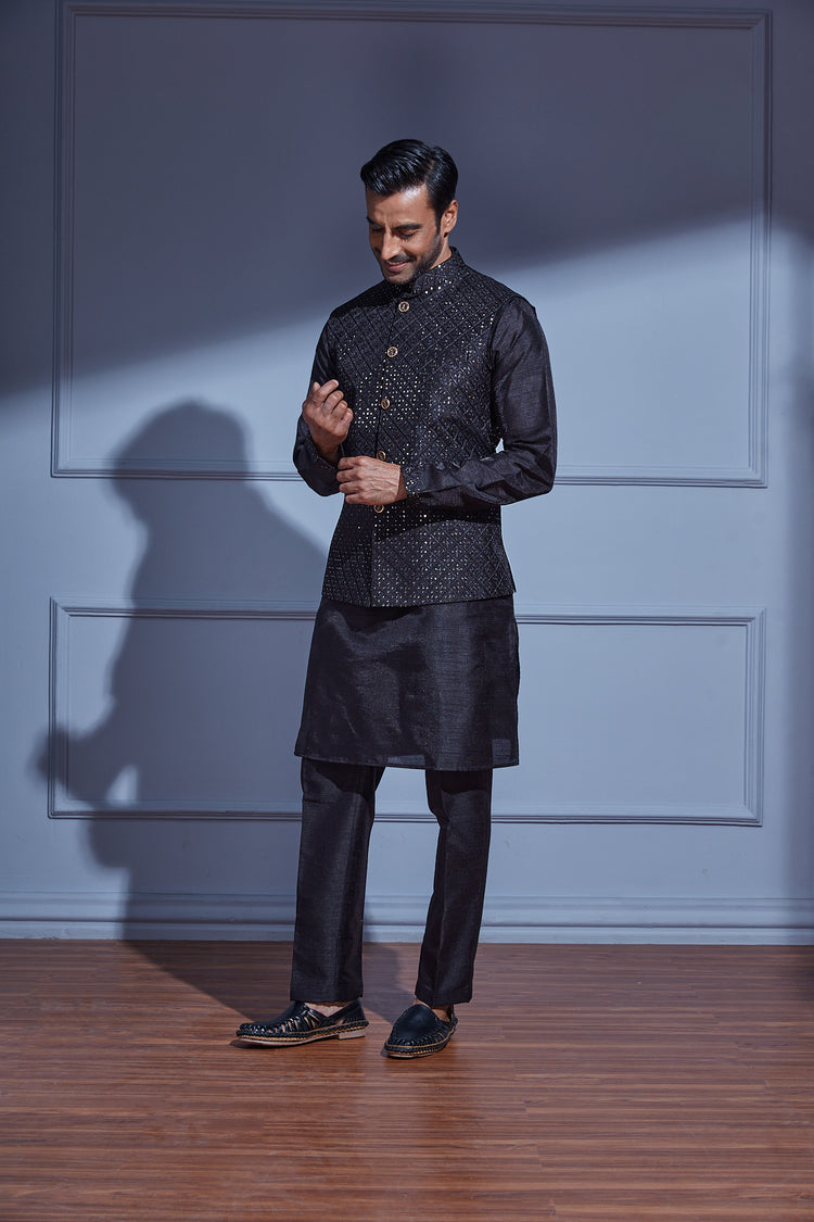 Create an impression with our striking Jaguar Black Jacket Kurta Set, adorned with all-over fine thread and sequin embroidery. The ensemble is enhanced by a matching solid-colored full-sleeve Kurta, featuring similar work on cuffs and collar. Paired with matching Aligarhi Pants, this set presents a distinctive and refined look suitable for any occasion.