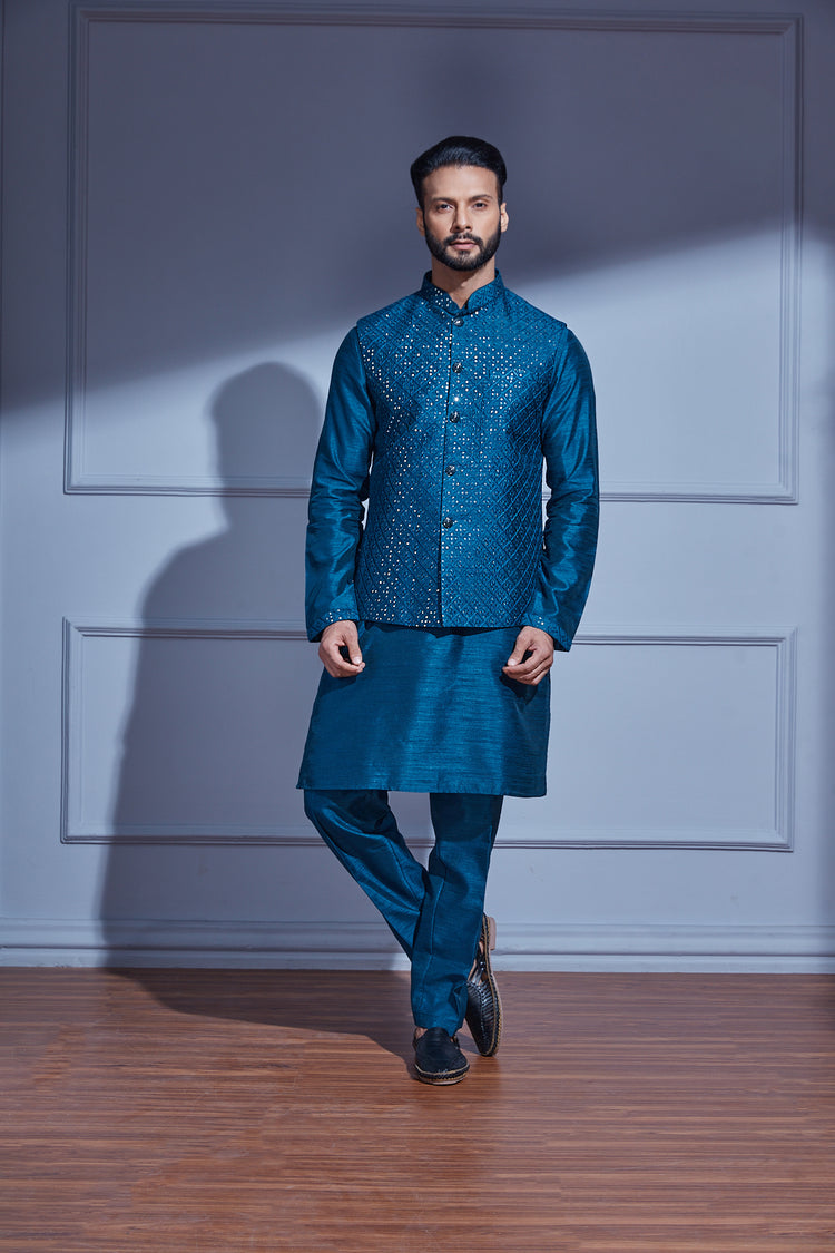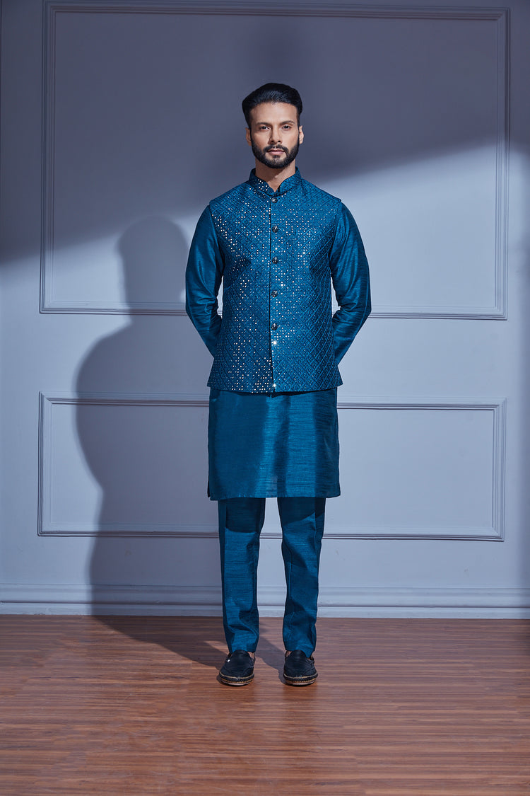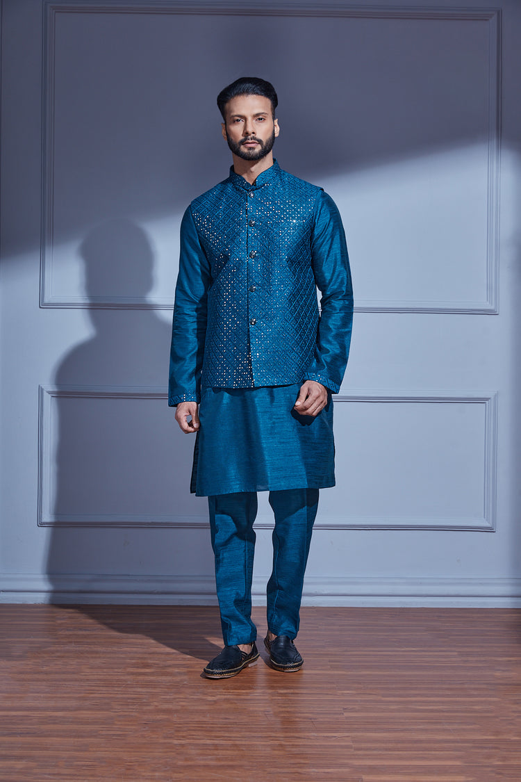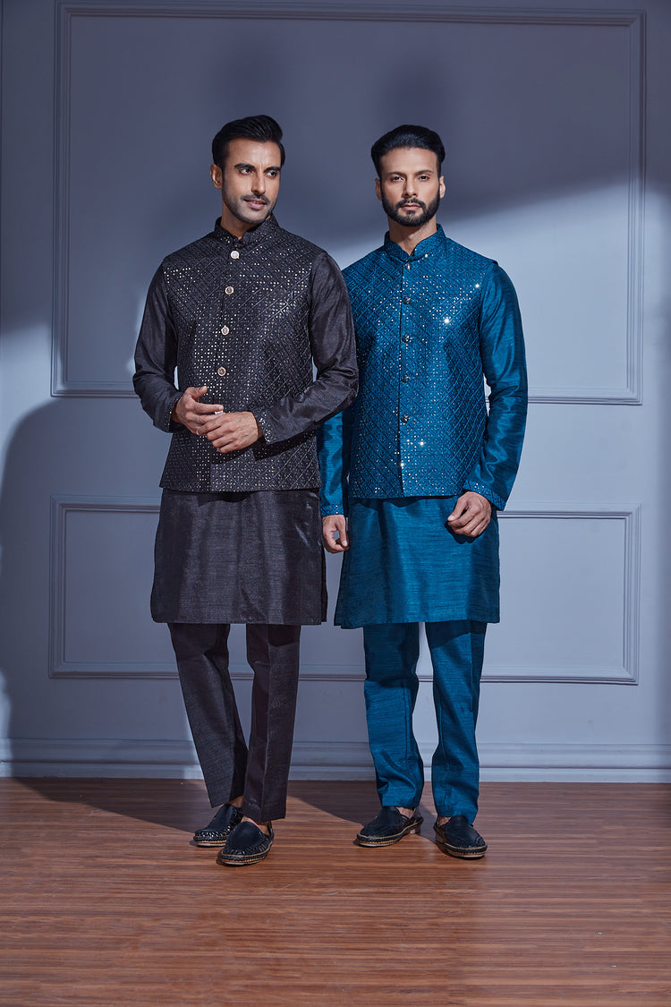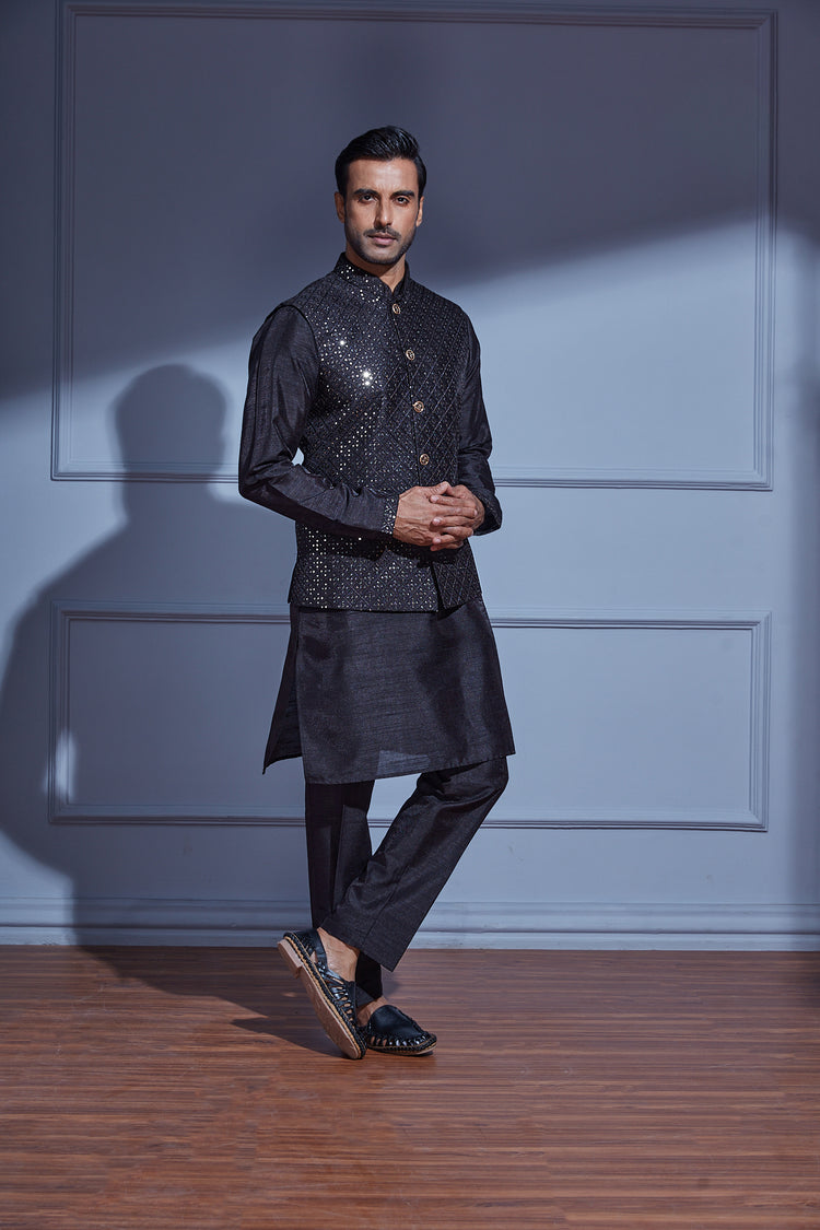 Create an impression with our striking Jaguar Black Jacket Kurta Set, adorned with all-over fine thread and sequin embroidery. The ensemble is enhanced by a matching solid-colored full-sleeve Kurta, featuring similar work on cuffs and collar. Paired with matching Aligarhi Pants, this set presents a distinctive and refined look suitable for any occasion.
