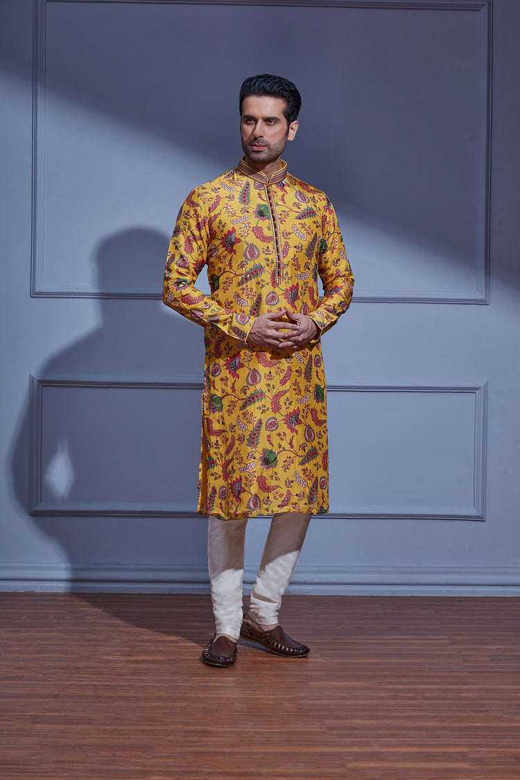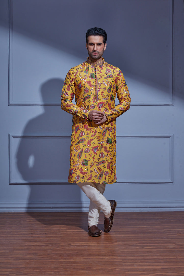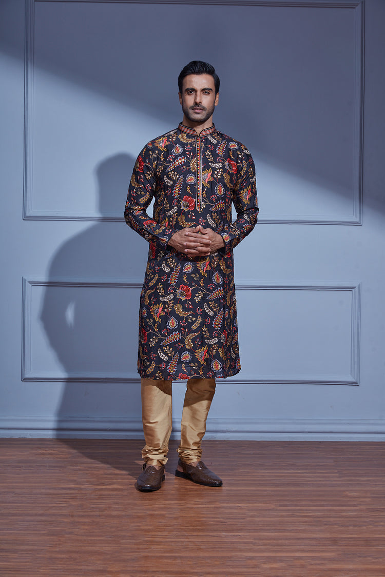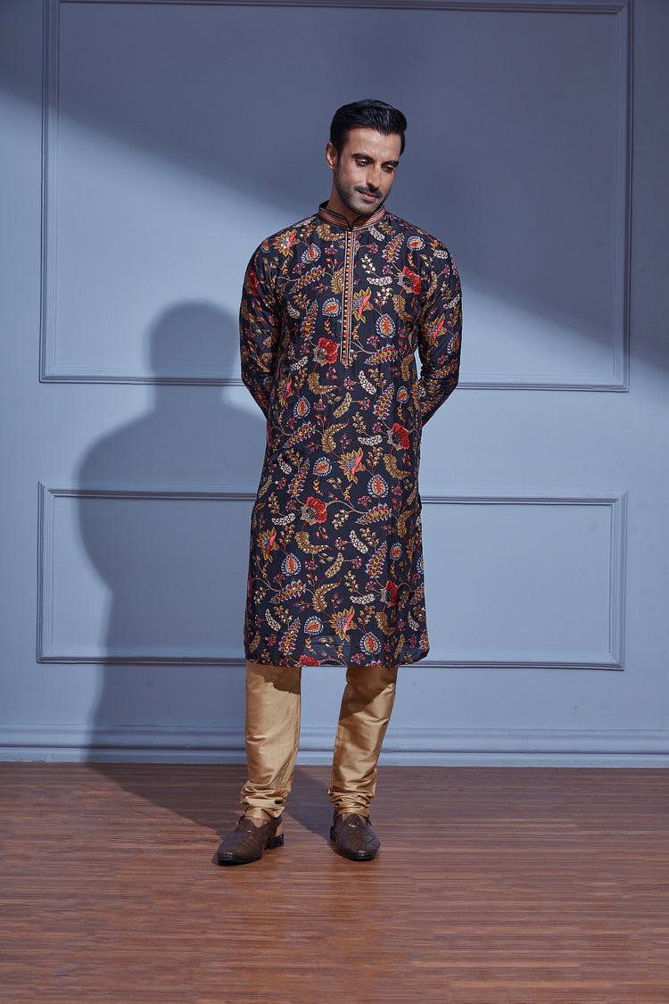 Enhance your elegance with this Jaguar Black Kurta Set flaunting Moughal floral embroidery on poly-blended fabric. The ensemble exudes sophistication with its linear embroidery on the collar and small colourful gotas on neckline, perfectly paired with a Cream Chudidar for a refined and polished look.