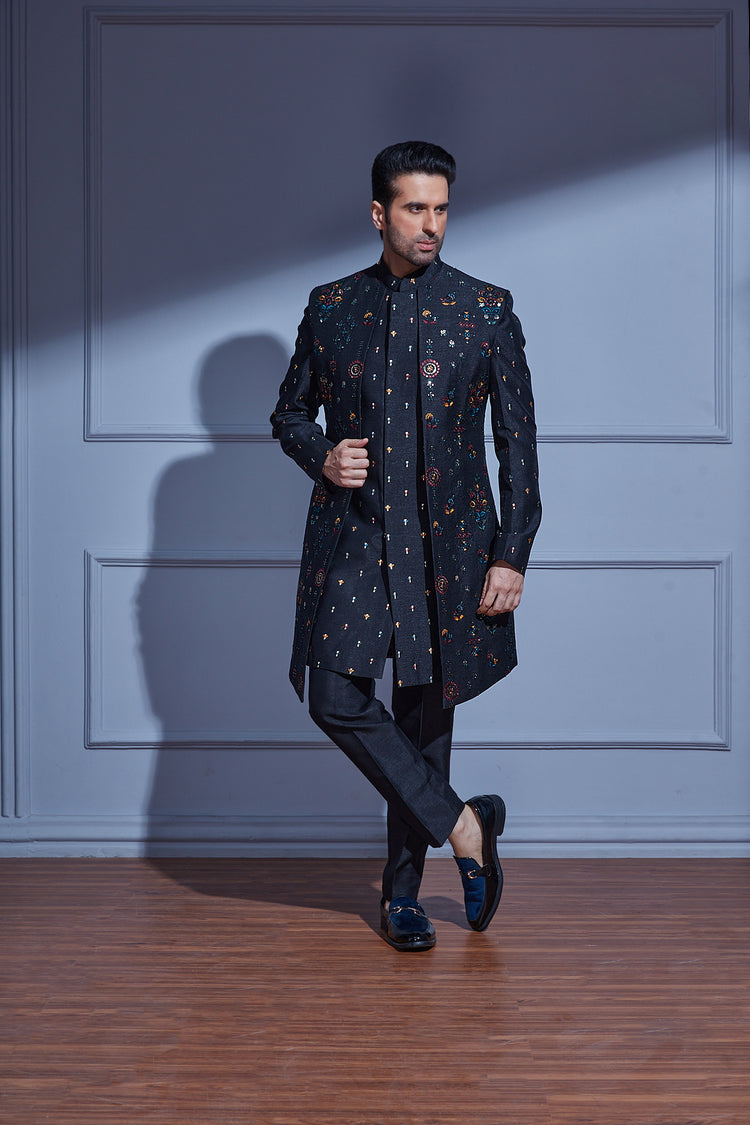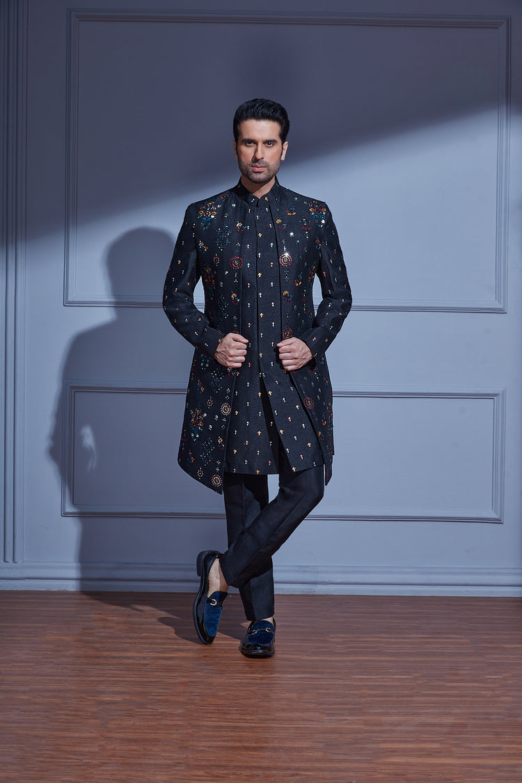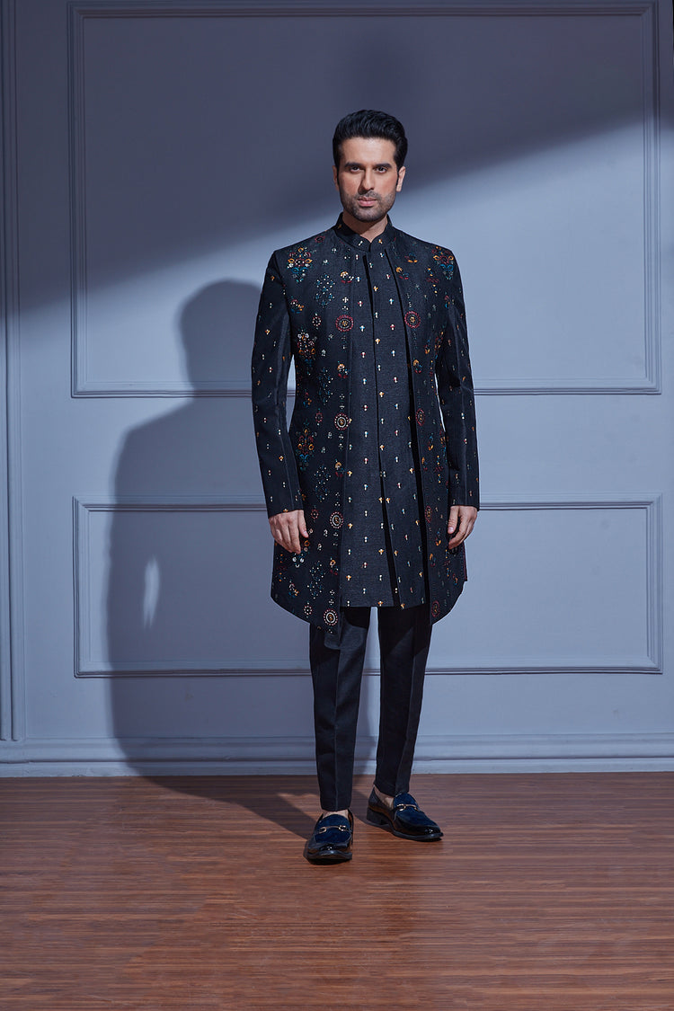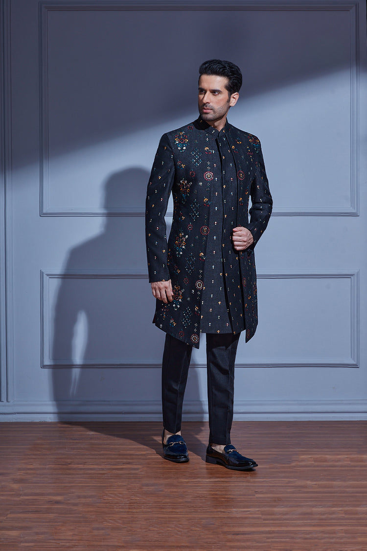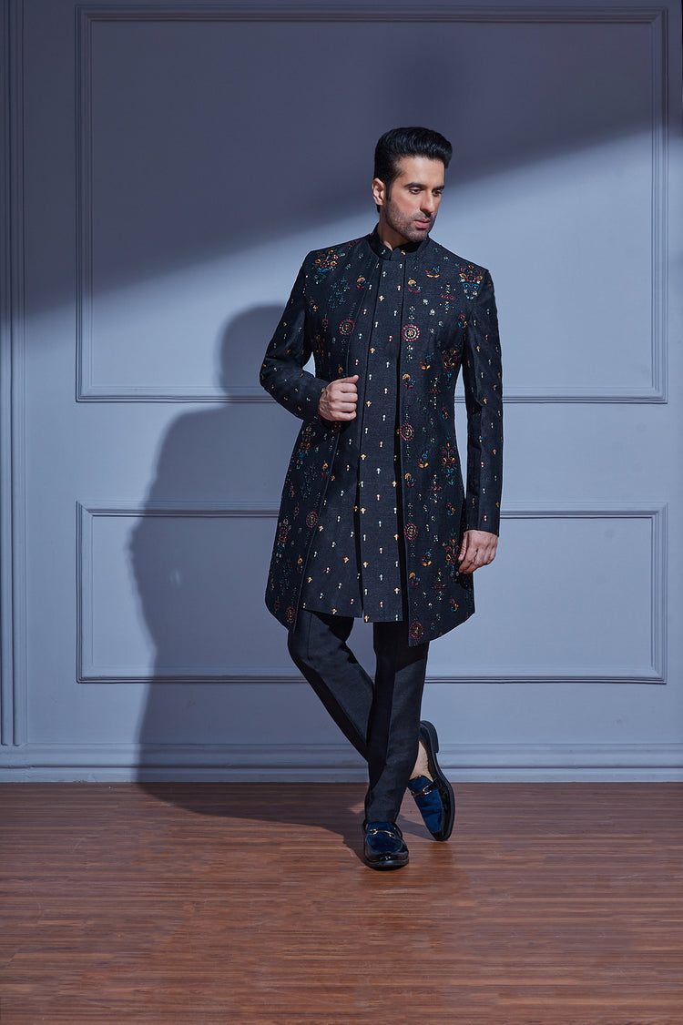Dress in regal splendor with this Glossy Black open Indo-Western, adorned with all-over floral thread and sequin work on outer full sleeve jacket and thread work buttas all over the inner jacket. The ensemble is perfectly complemented by classic Aligarhi Pants in Black.