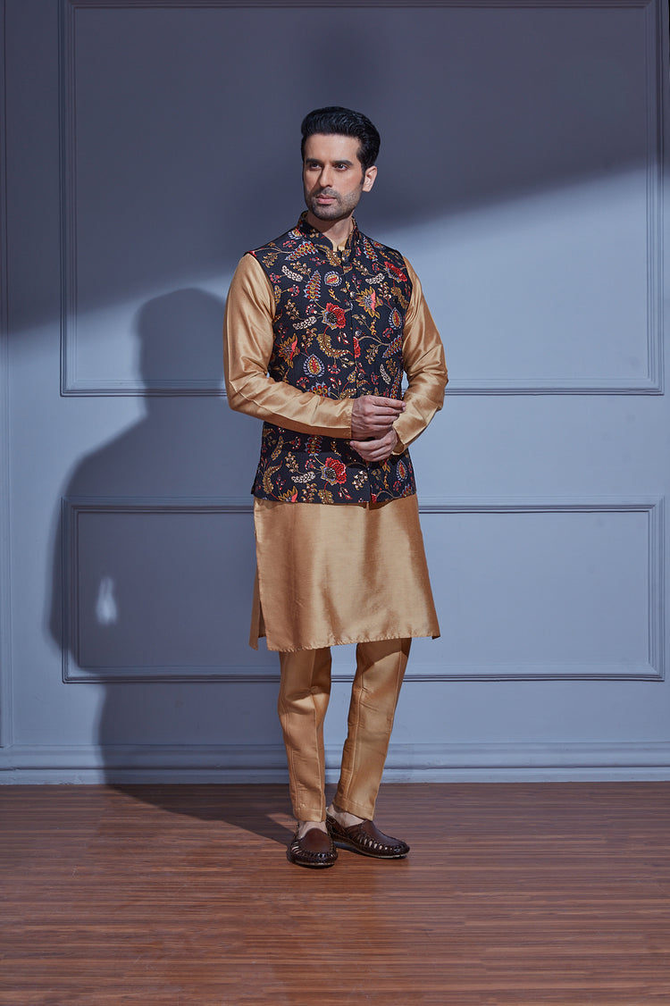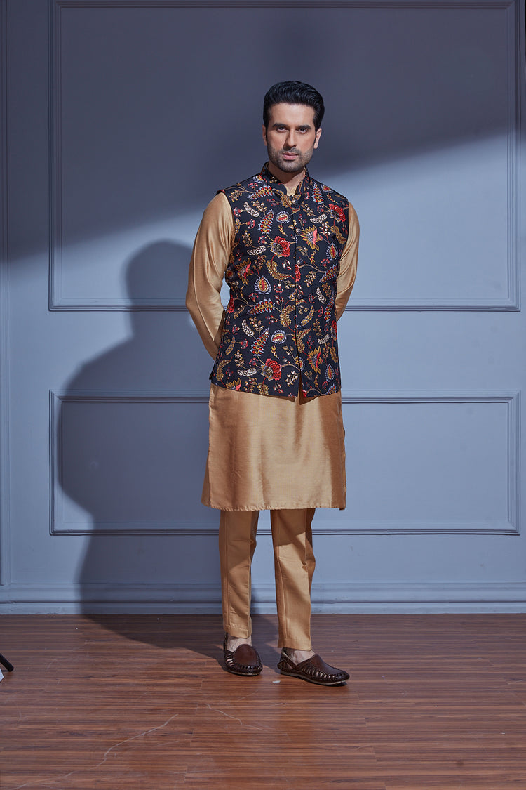 JAGUAR BLACK PRINTED JAKET WITH SOLID GOLD KURTA SET
