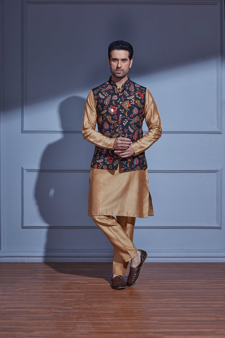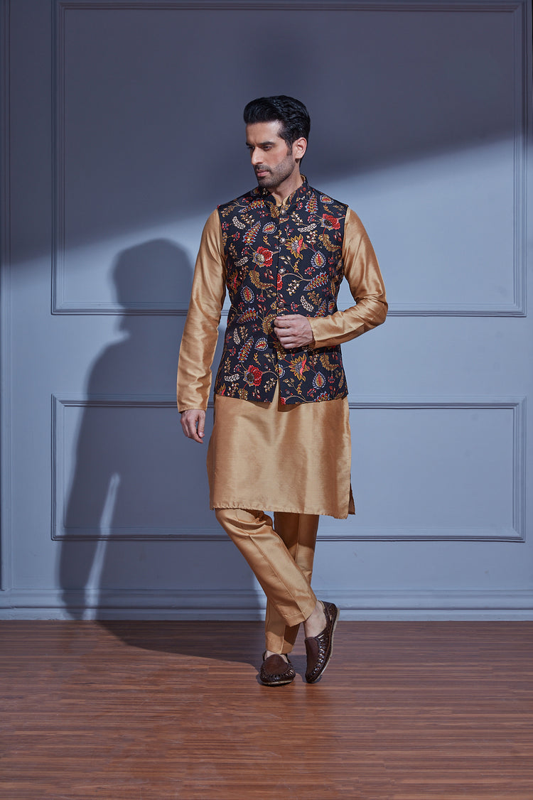 Look elegant in our Jaguar Black Printed Jacket with Solid Gold Kurta set, showcasing all-over unique multicolured floral thread embroidery. The ensemble is elevated by a matching solid gold-colored full-sleeve Kurta. Paired with matching Aligarhi Pants, it forms a versatile and refined ensemble suitable for any occasion.