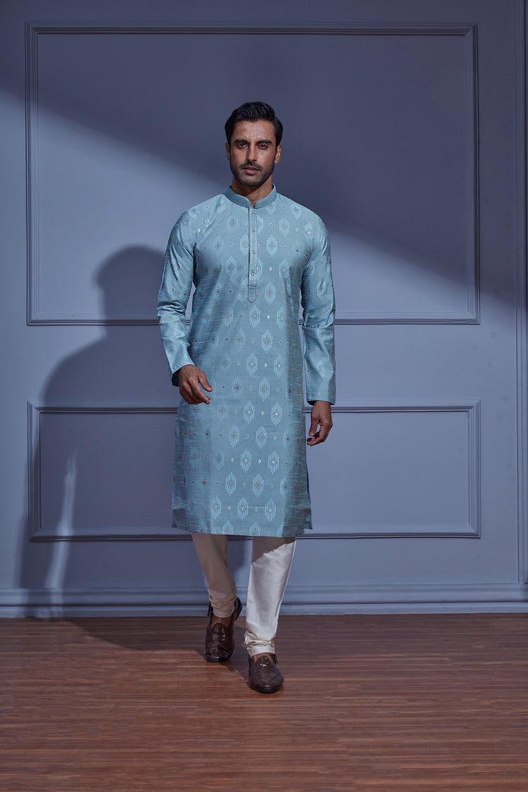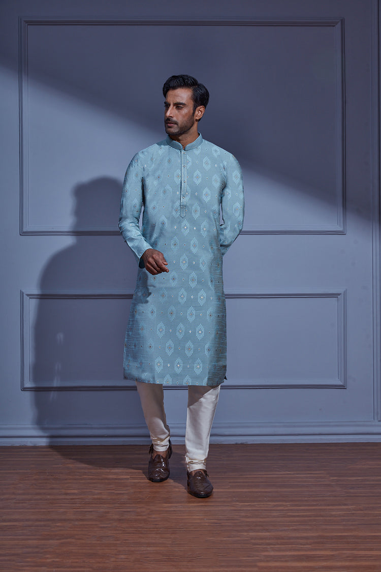 Indulge in sophistication with this Afternoon Sky Blue Kurta Set, featuring a delightful all over spread of sequins atop small prints on poly-blended jacquard fabric. The ensemble is elevated by an embroidered collar and neckline, perfectly paired with a cream Chudidar for a refined look.