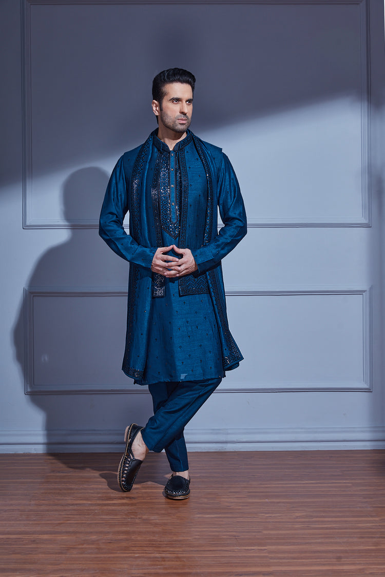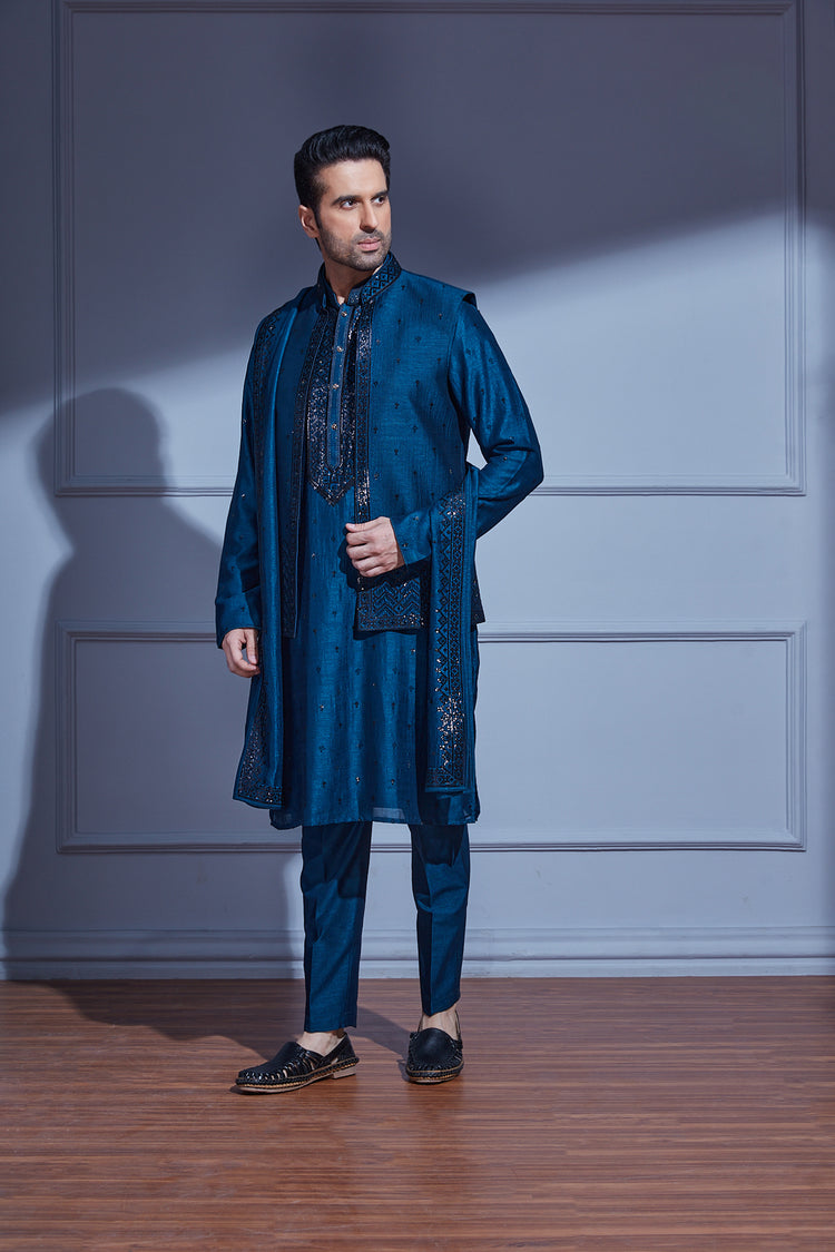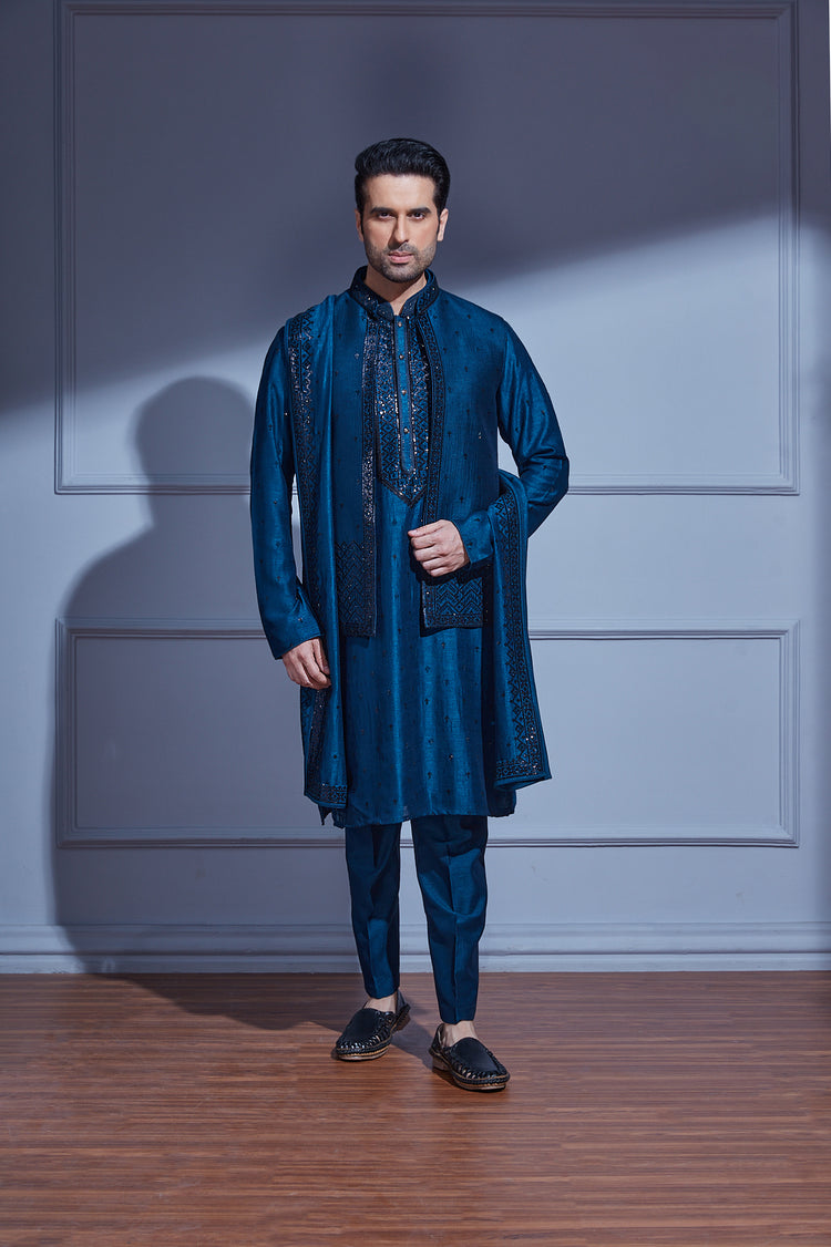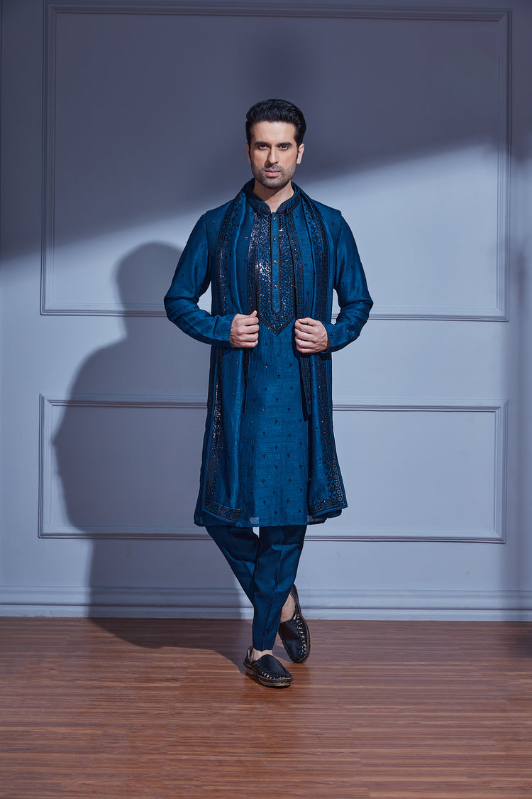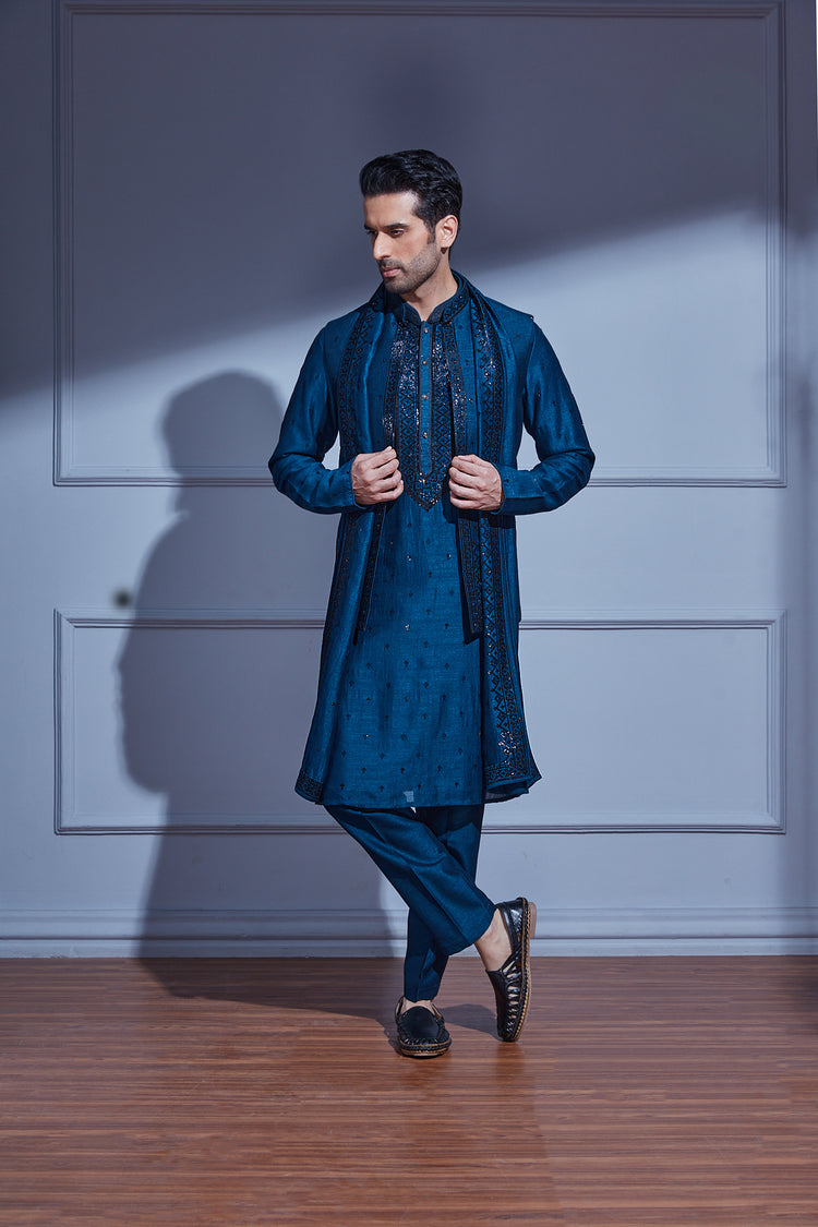 Create an impression with our Marine Blue open Jacket Kurta Set with Dupatta, adorned with all-over fine buttis and sequin embroidered border and neckline. The ensemble is enhanced by a matching full-sleeve Kurta with fine neckline embroidery, featuring similar work on border of Dupatta. Paired with matching Aligarhi Pants, this set presents a distinctive and refined look suitable for any occasion