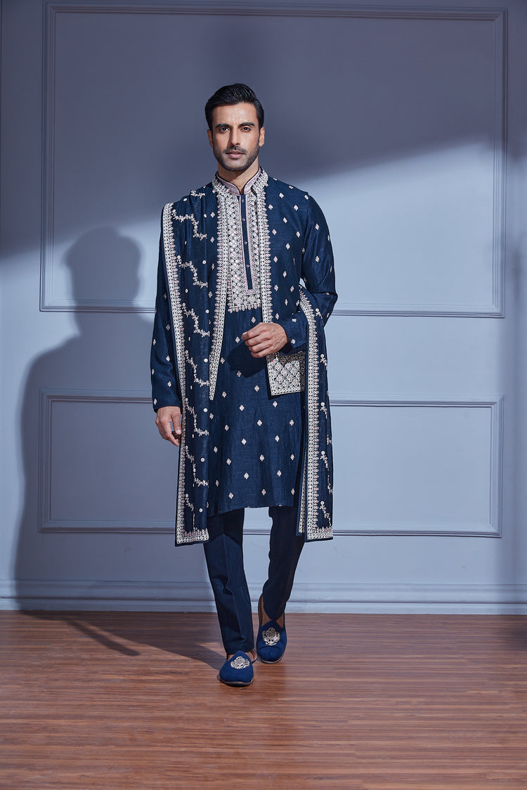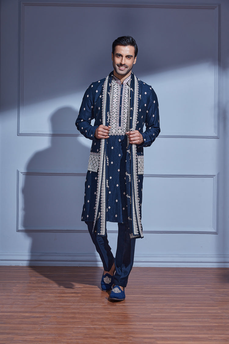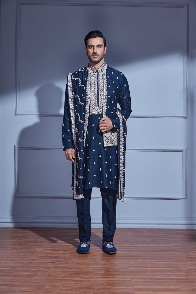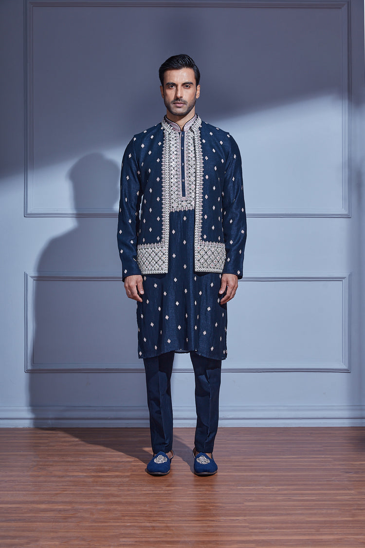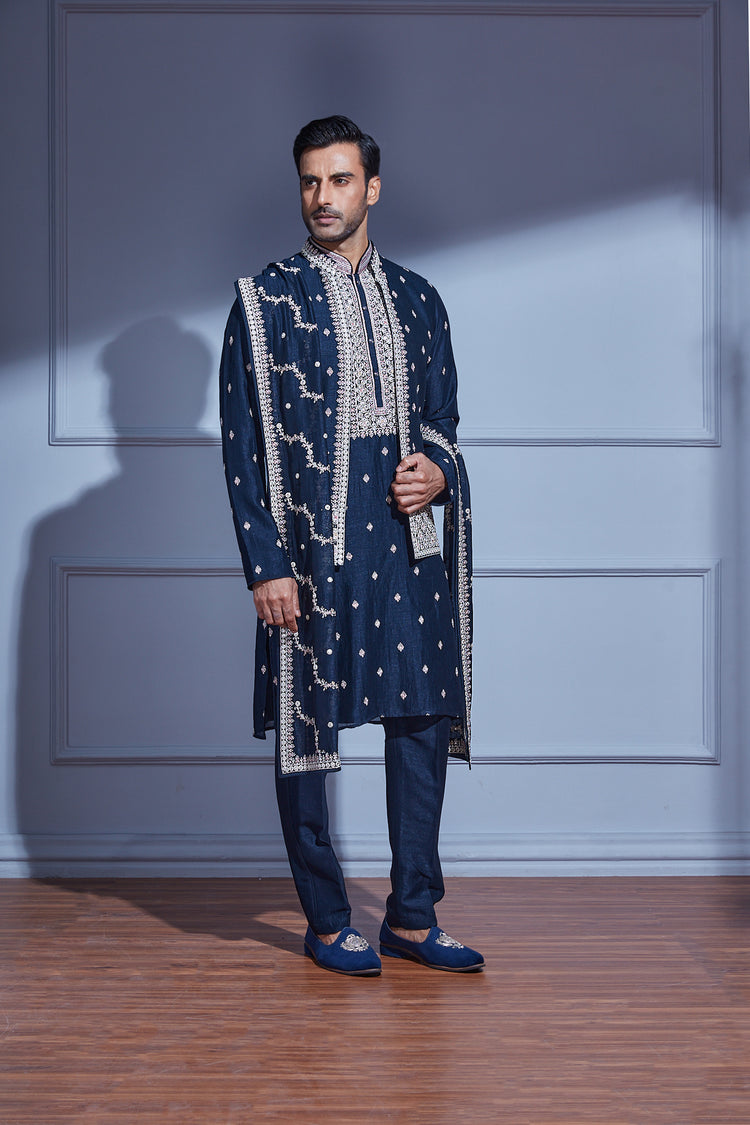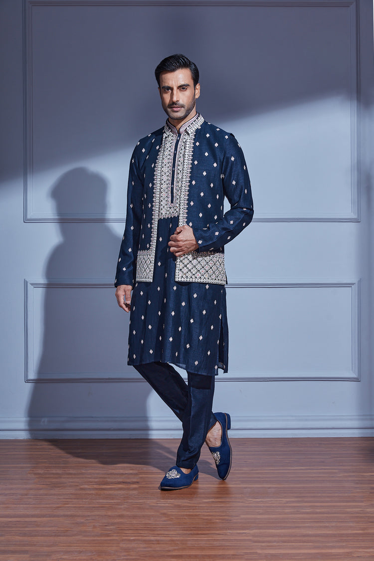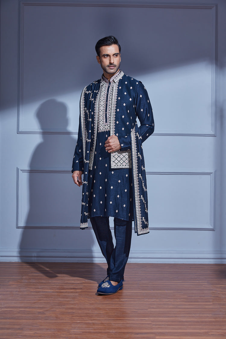 Make a statement with our Dark Nile Blue Open Jacket Kurta Set with Dupatta, embellished with all-over fine Buttis and embroidered border, neckline, and a thick bottom. The ensemble is elevated by a matching full-sleeve kurta with fine neckline embroidery, featuring similar work on the border of the Dupatta. Paired with matching Aligarhi pants, this set presents a distinctive and refined look suitable for any occasion.