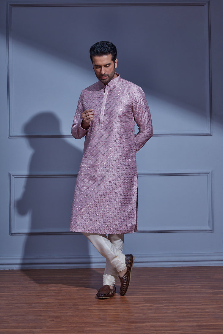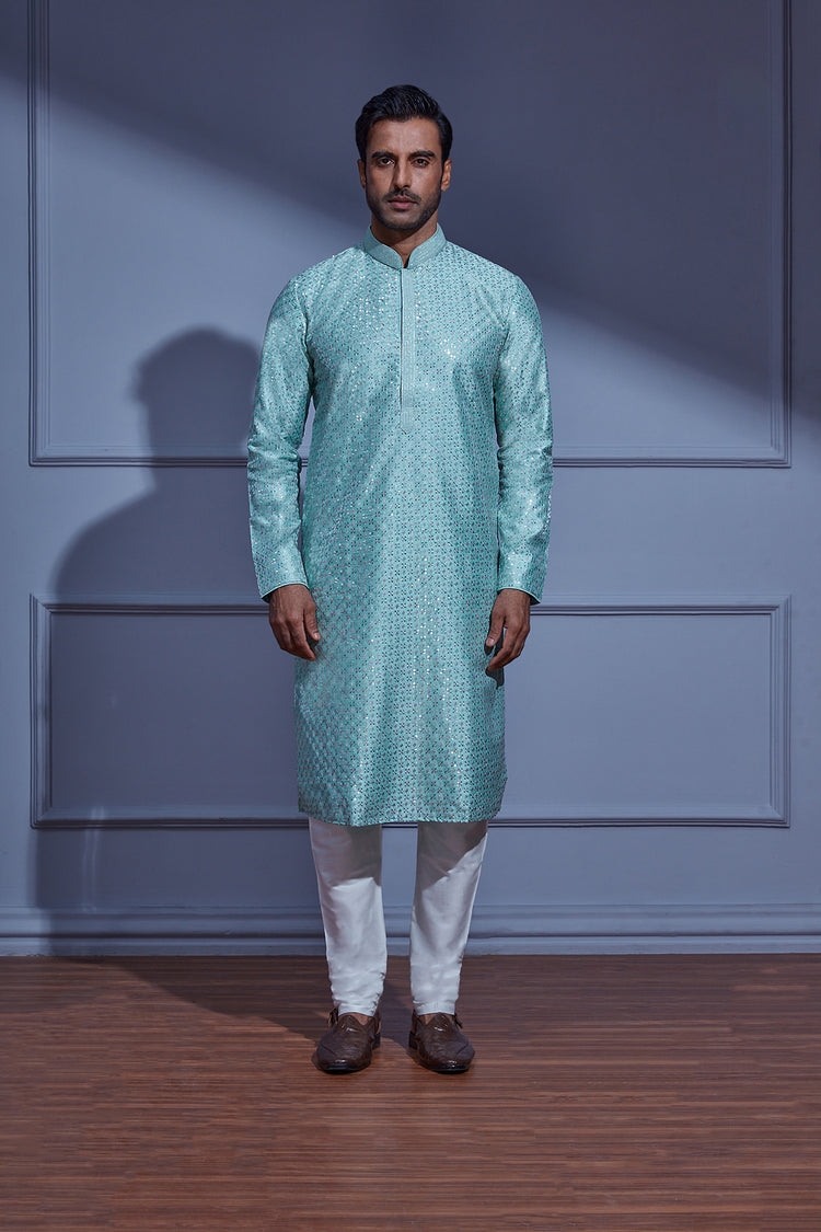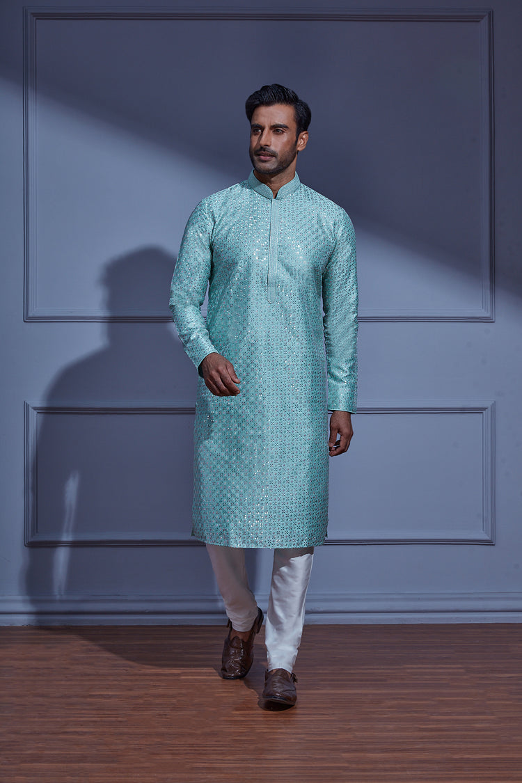 Elevate yourself in style with this Glacier BLUE Kurta Set, embellished with all-over thread and sequin embroidery on poly-blended fabric. The ensemble is gracefully adorned with linear embroidery on the collar and neckline, complemented by a Cream Chudidar for a refined and sophisticated look.