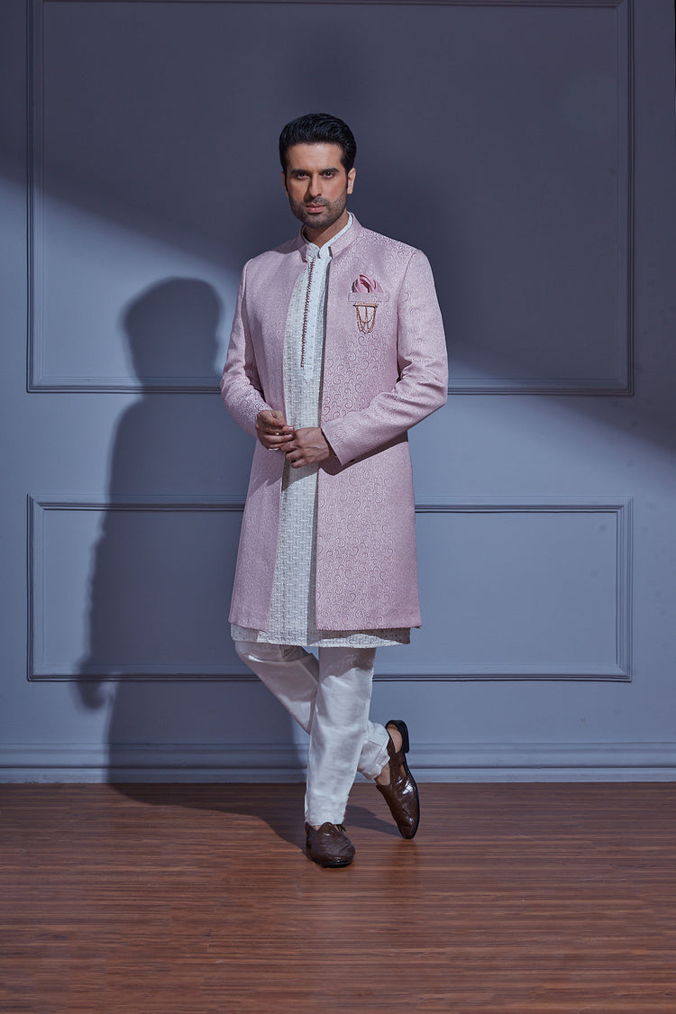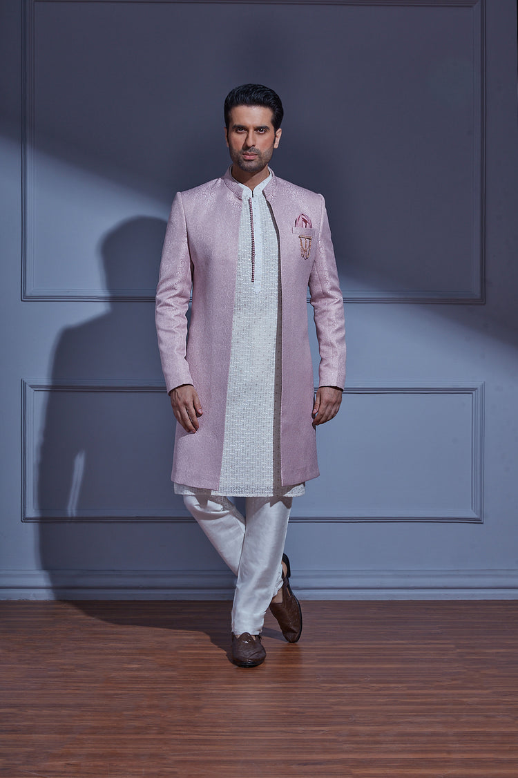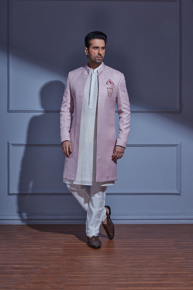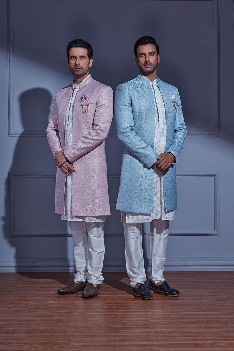 Presenting an Indo-Western ensemble in Skyline Blue, featuring a full-sleeved front-open slit Jacket made from a unique fabric with self motifs. It is impeccably matched with a Pearl White full-sleeve, long plain Schiffli inner Kurta. The ensemble is perfected with a complementary Chudidar, making it an excellent choice for grooms at their engagement or cocktail ceremonies.