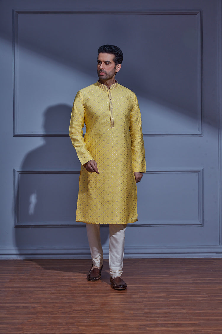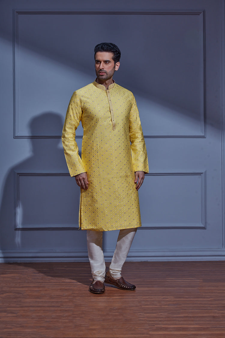 Infuse vibrancy into your wardrobe with our Sunny Yellow Kurta Set, showcasing an all-over pattern print and delicate Sequin work on Jacquard fabric. The ensemble is detailed with linear embroidery on the collar and neckline, elegantly paired with a Cream Chudidar for a timeless and polished look.