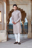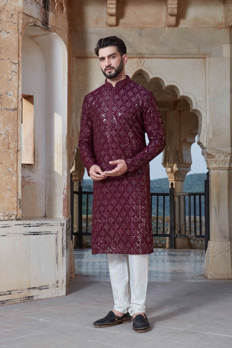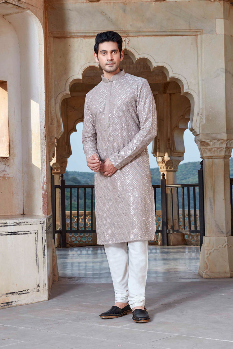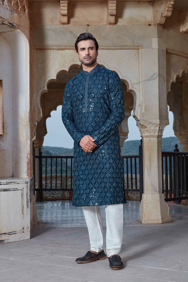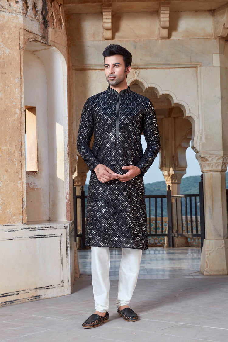 Charcoal black kurta set, showcasing mesmerizing sequin and thread work that reflects the opulence, Paired with crisp white pajama bottoms.