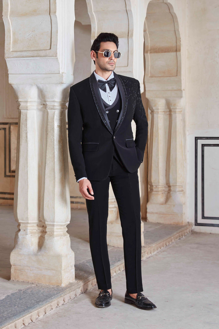 Spice Up your evening wear with our Charcoal Black well crafted Tuxedo Set, embellished with exquisite hand embroidery lapel and sequin work on left shoulder and breast for an elegant formal look. This Three piece ensemble Completed with matching Trousers suitable any formal occasion