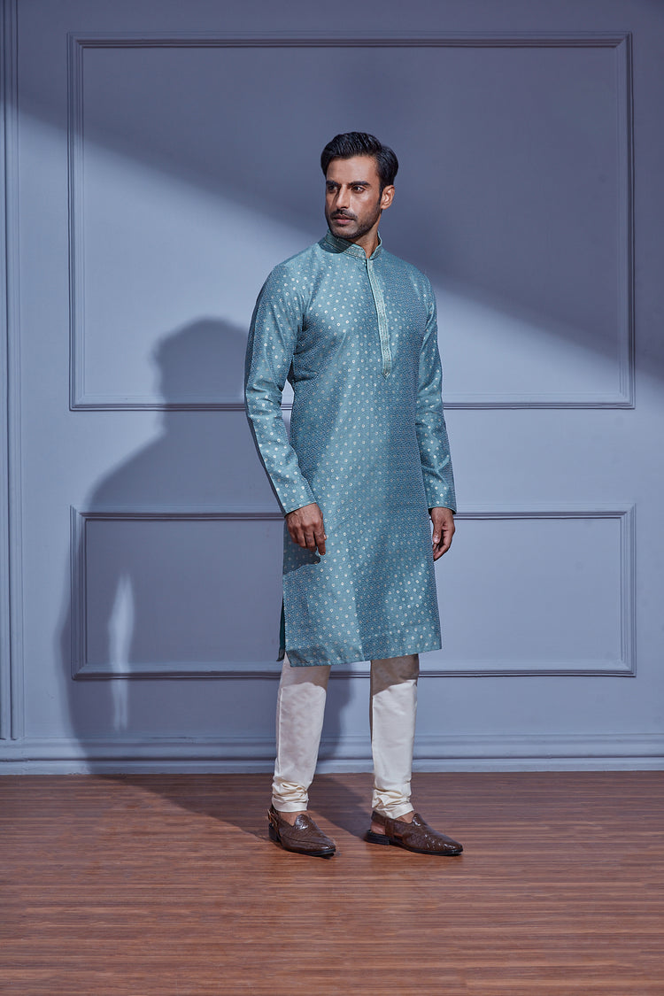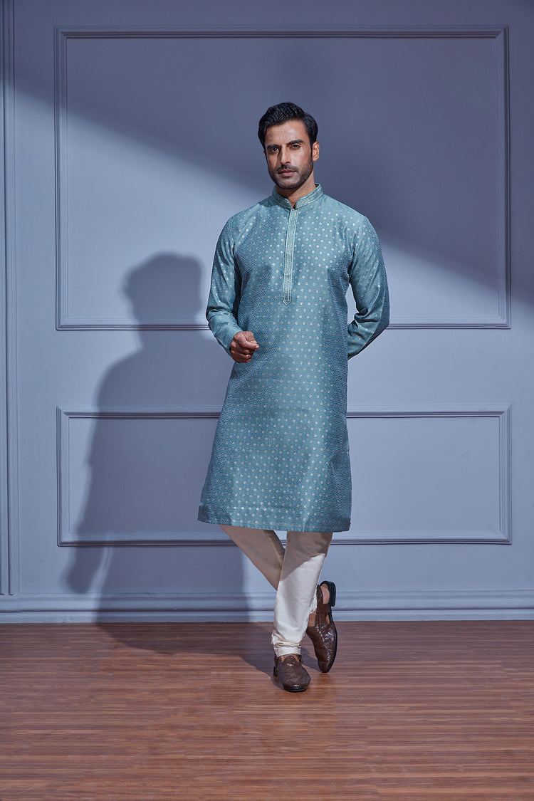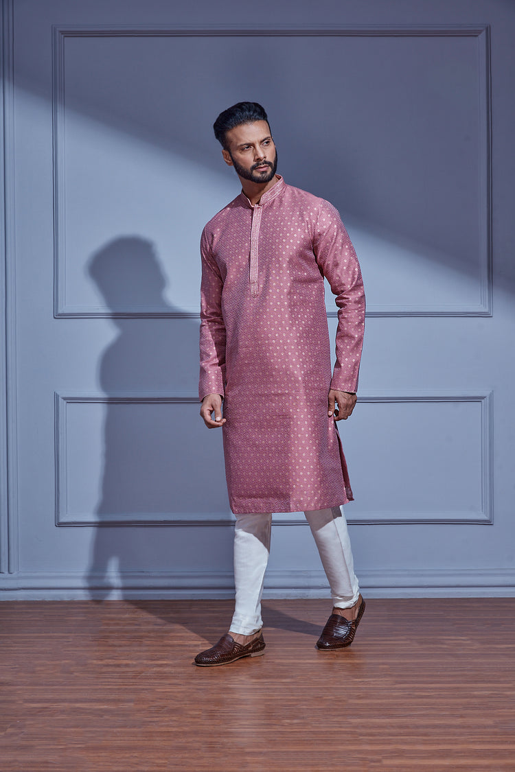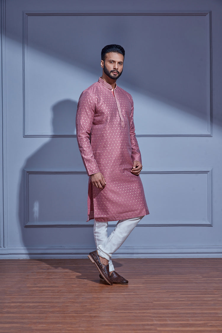 Adorn yourself in elegance with this Dull Onion Pink Kurta Set, featuring all-over gold Butti on poly-blended jacquard fabric. The ensemble is completed with an embroidered collar and neckline, adding a touch of refinement to your look.
