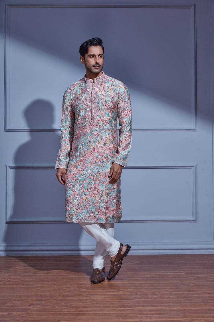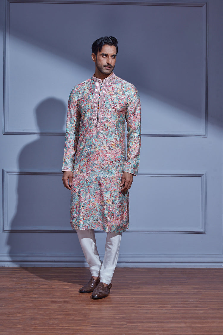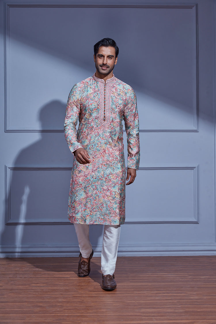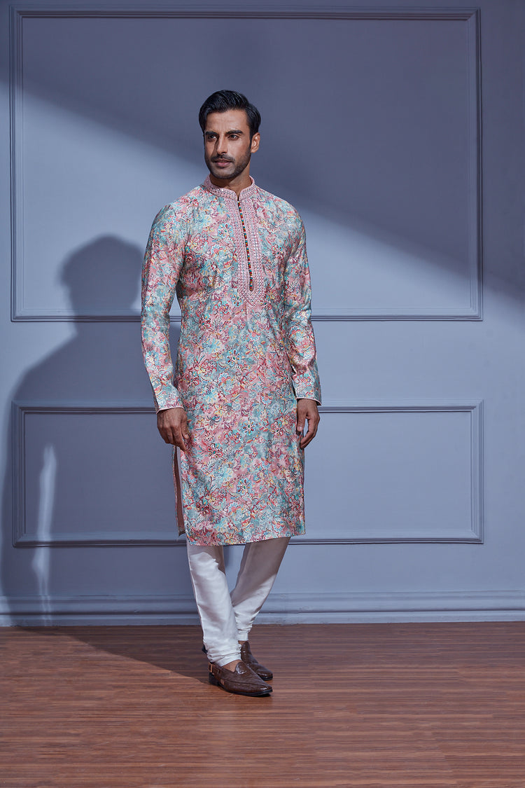 Dress in vibrant style with this Multicolored Kurta Set, showcasing floral embroidery on printed fabric and an intricately embroidered neckline. Complementing Off-White / Cream Chudidar makes it a perfect blend of color and craftsmanship for a distinctive look.