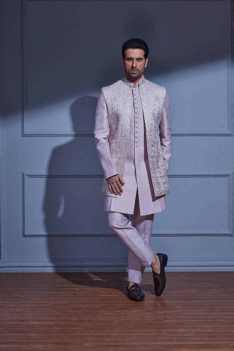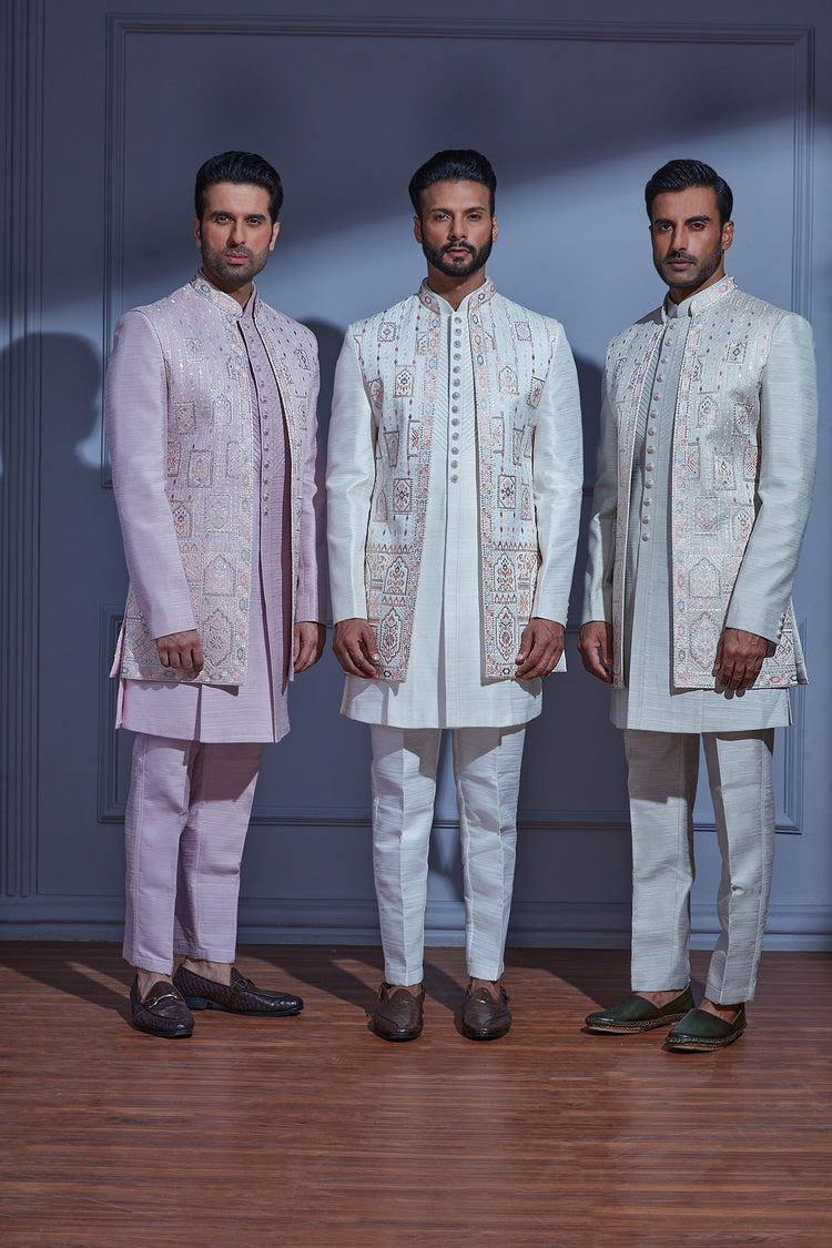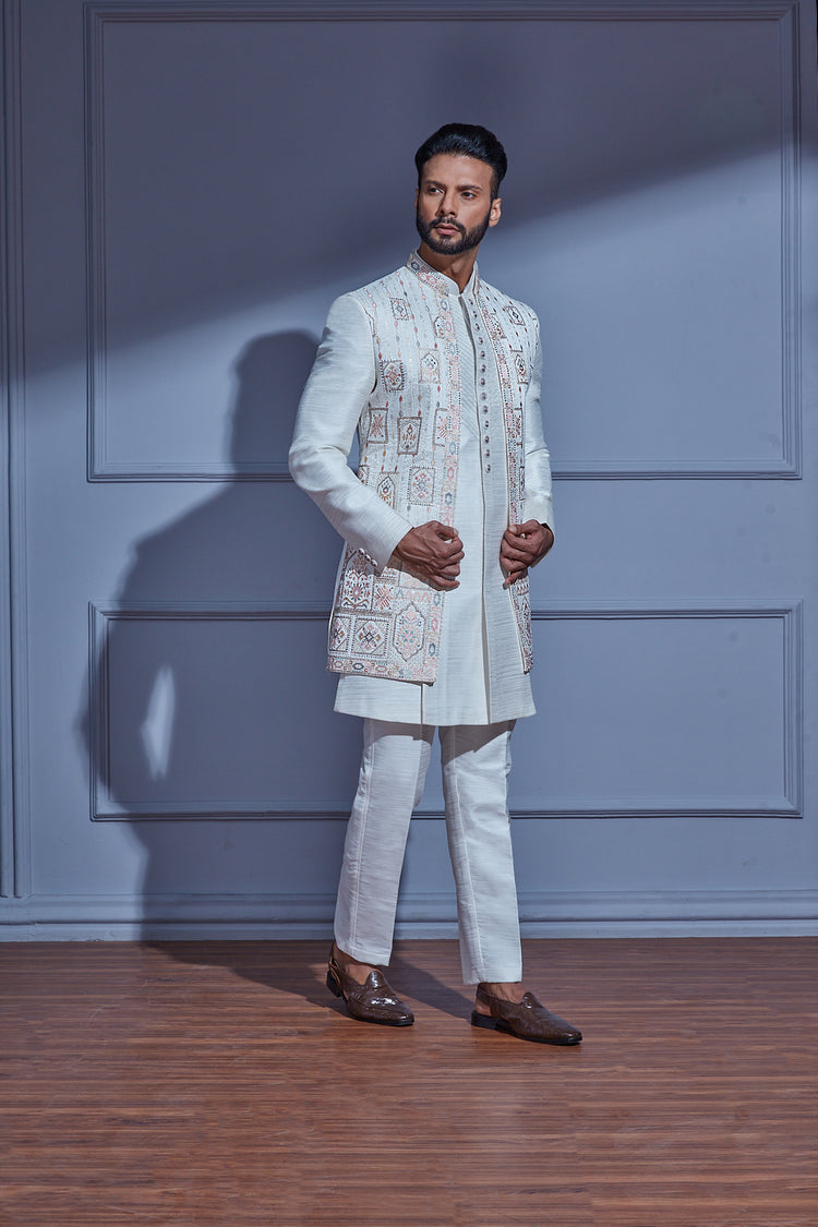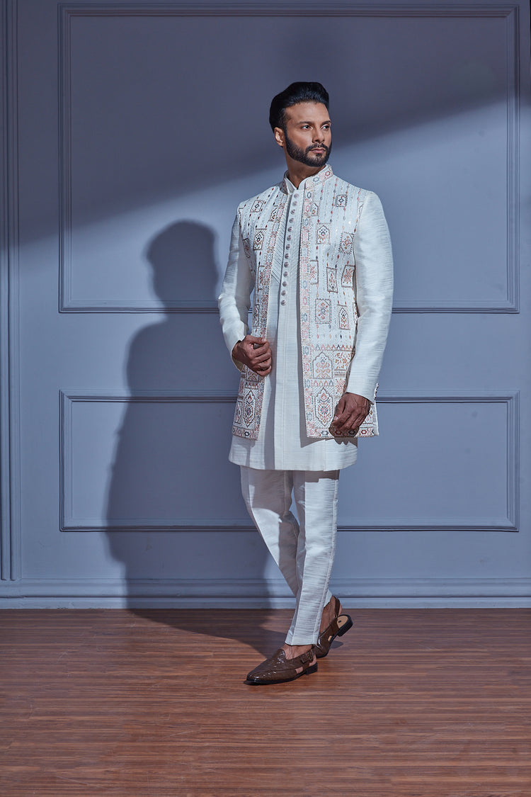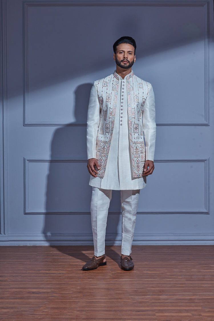 This Indo - Western is a Mint Cream-hued, sleeveless, front-open slit jacket with a distinctive print, perfectly paired with a matching full-sleeve, long plain inner. The ensemble is completed with self straight-fit Pants, making it an ideal choice for grooms during their engagement or cocktail ceremonies.