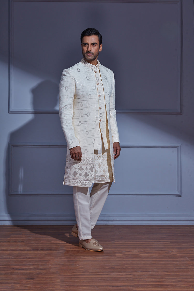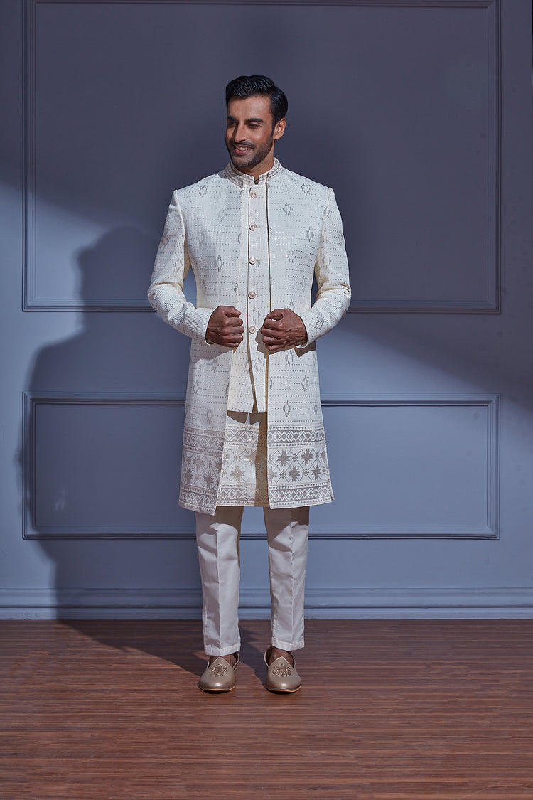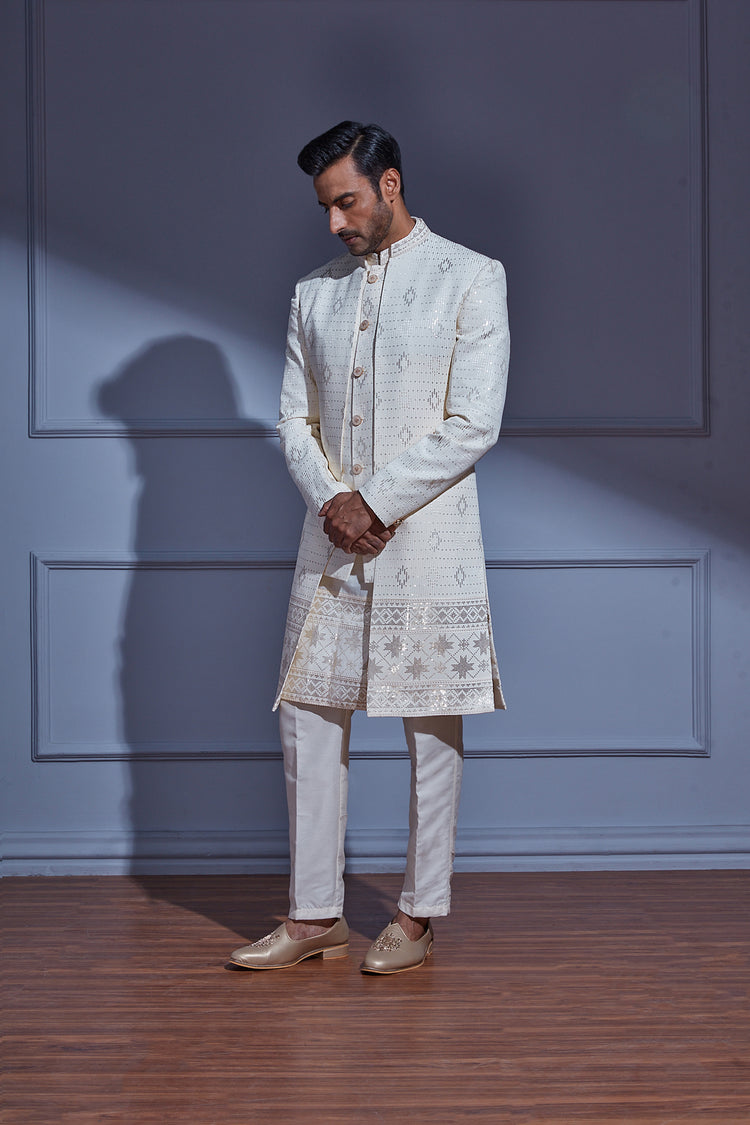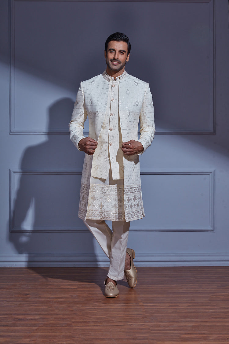Dress to impress in this Frosting Cream open Indo-Western with inner jacket and Kurta, Embroidered with an all-over fine sequin work for a touch of Moroccan broad bottom. The light cream short inner jacket and long Kurta with similar work adds a perfect seamless blend which is paired with matching Aligarhi Pants.