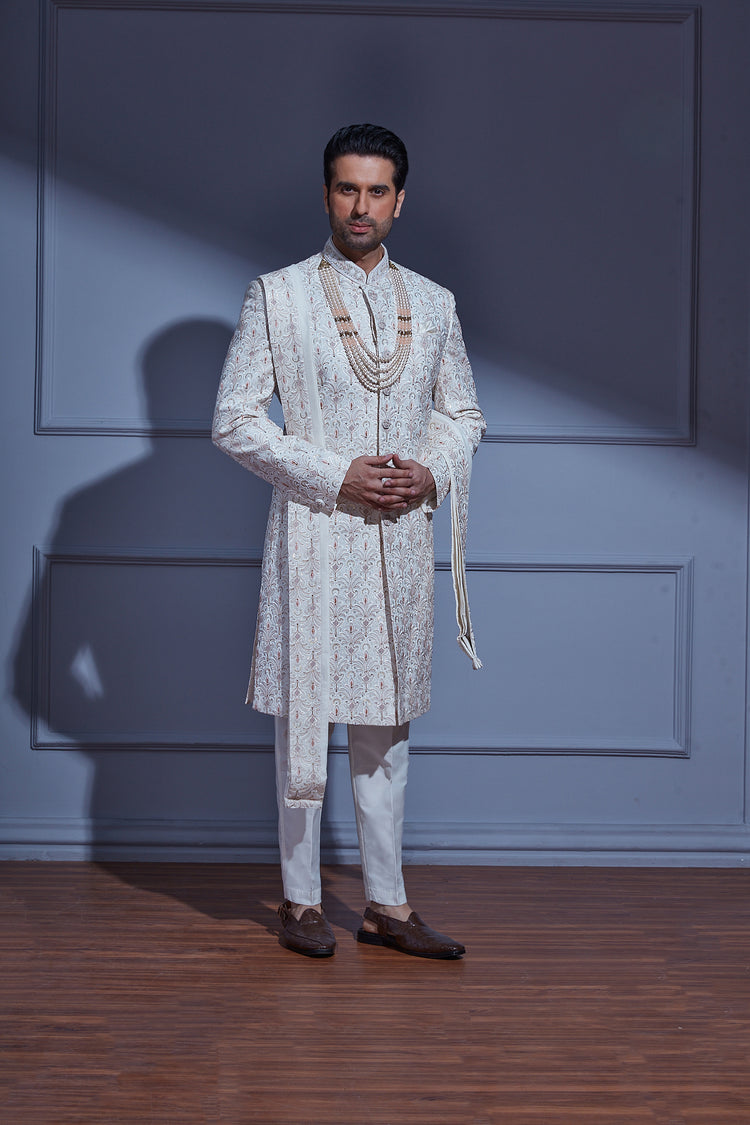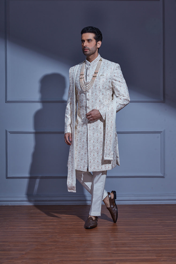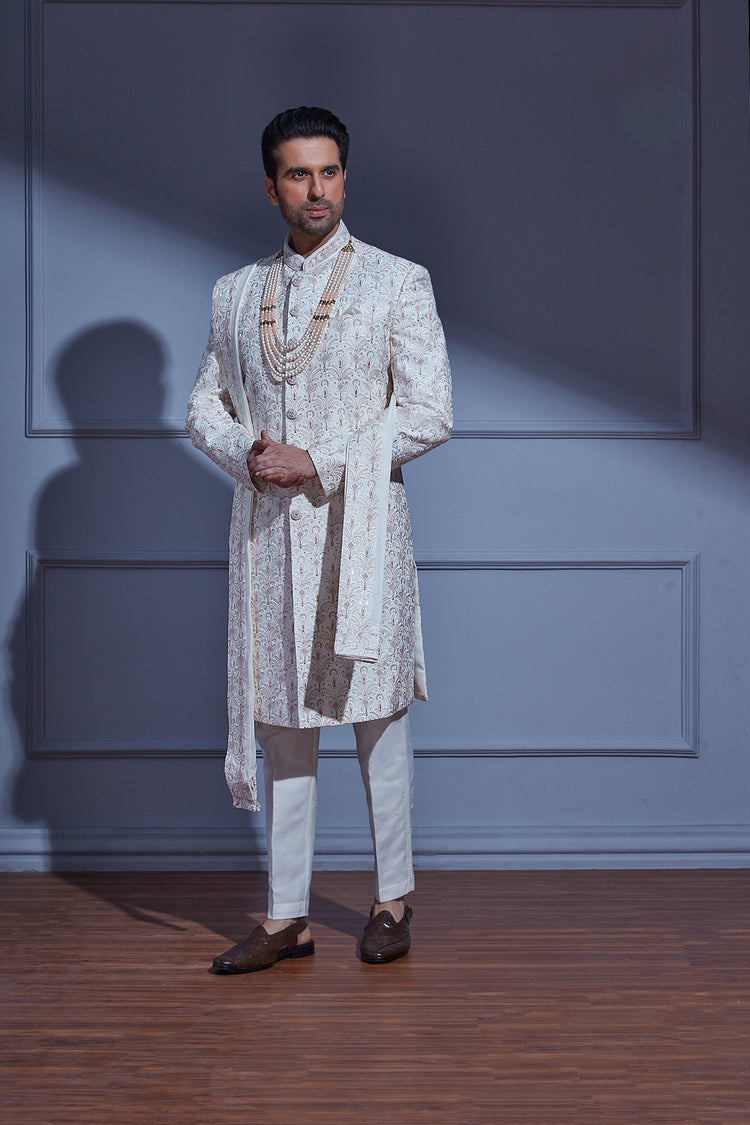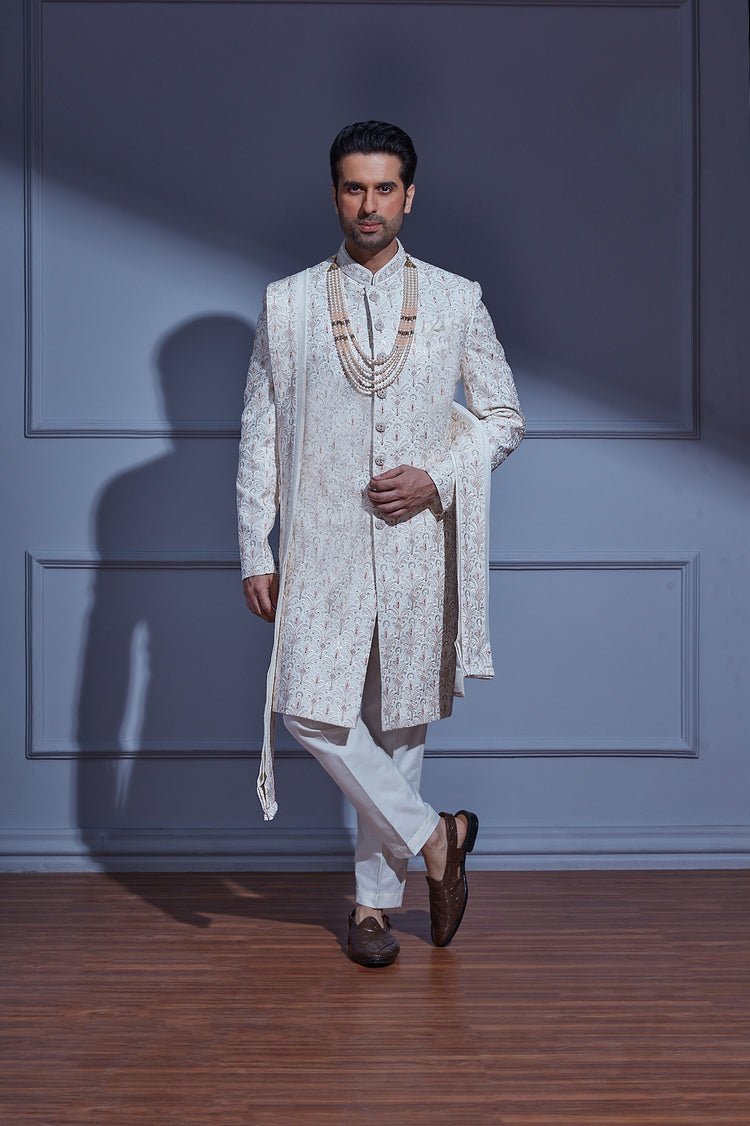 An impressive Pearl Cream Sherwani, adorned with detailed pattern embroidery, is ideal for special occasions. Enhancing the ensemble with a matching Dupatta featuring an embroidered border, and finalize the look with coordinating Aligarhi Pants. This stunning combination is well-suited for making a stylish statement at any special event.