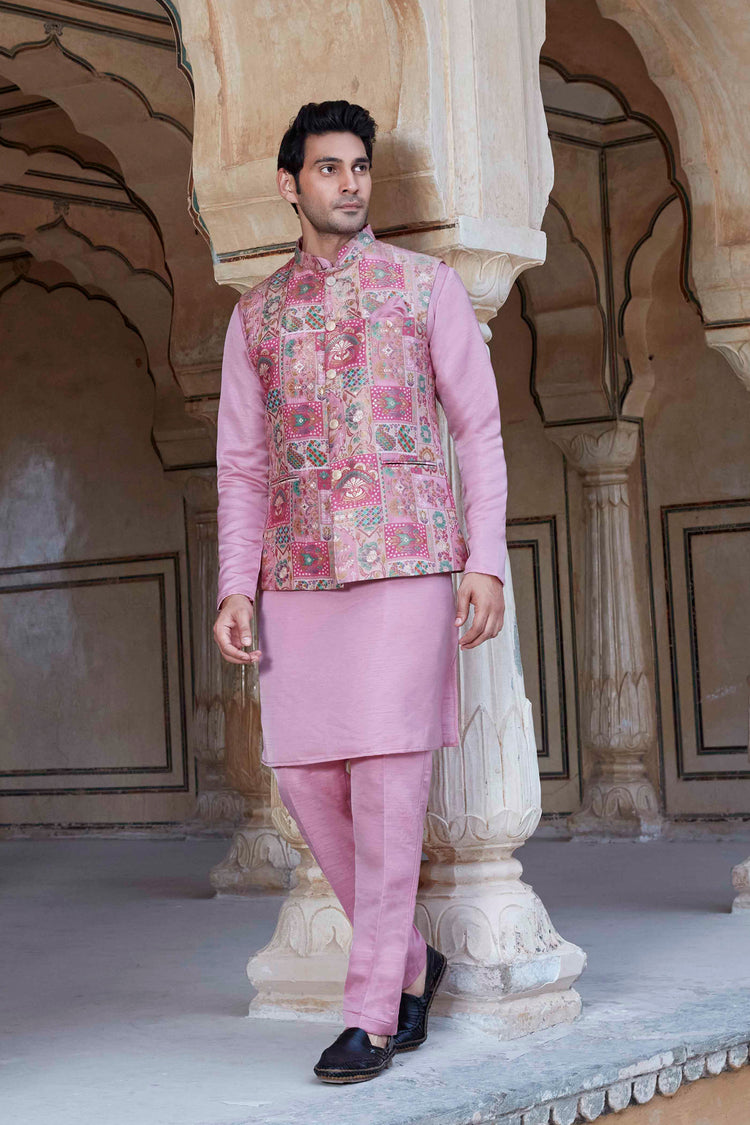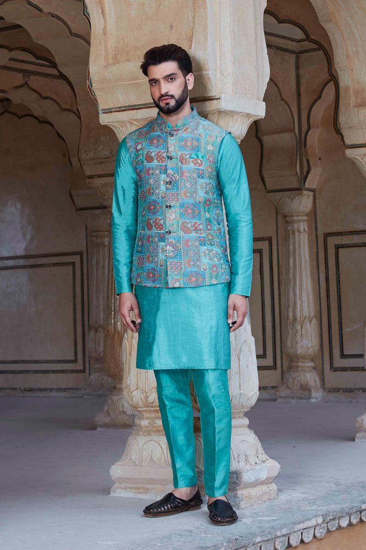 Light Firozi Jacket Kurta set, with sleeveless jacket is fashioned from luxurious printed jacquards. Completed with a matching solid-colored Kurta and Aligarhi Pants, this set exudes sophistication.