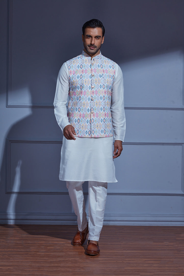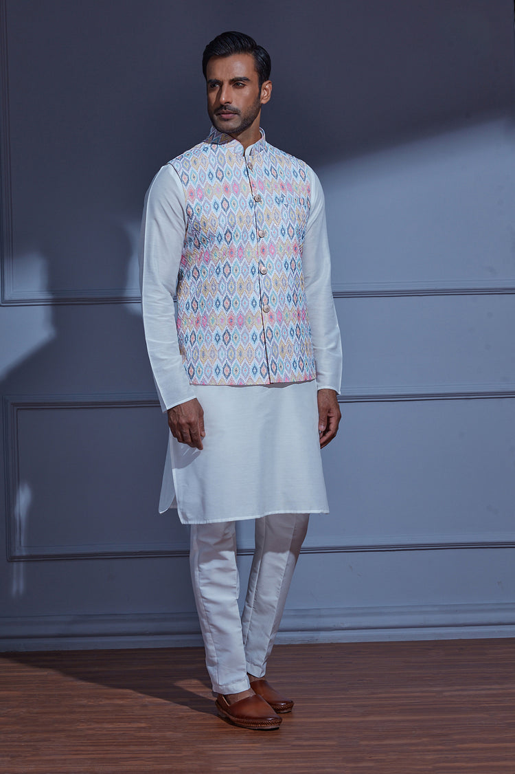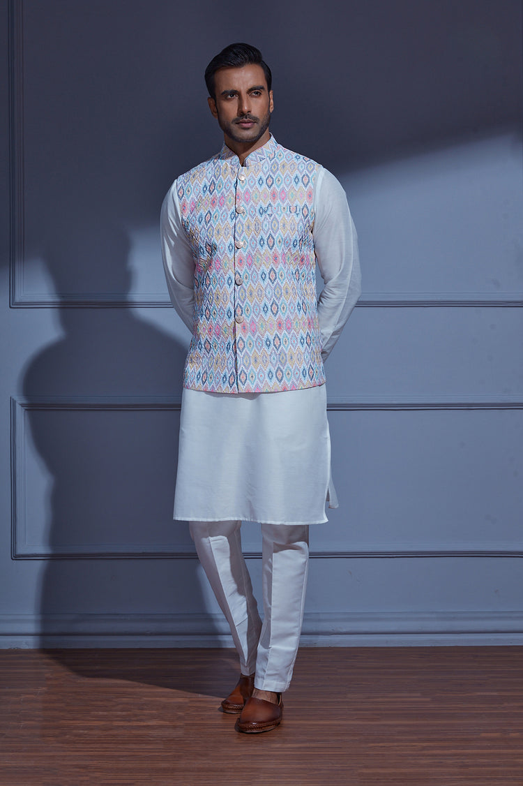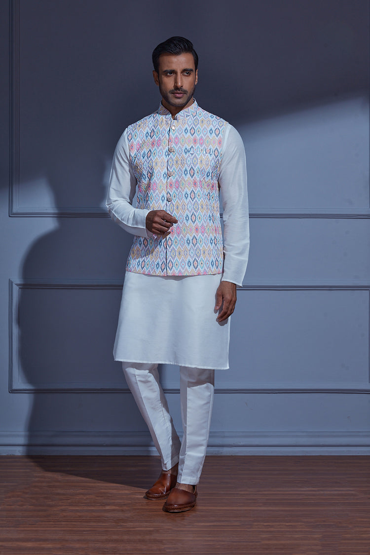 This Schiffli Jacket showcases an all-over Multicolor printed design in soft hues. The knee-length full sleeve Off-White Kurta boasts a straight fit, perfectly blended with complimentary Aligarhi Pants enhancing the overall charm of the attire. A stylish look with a touch of traditional elegance.