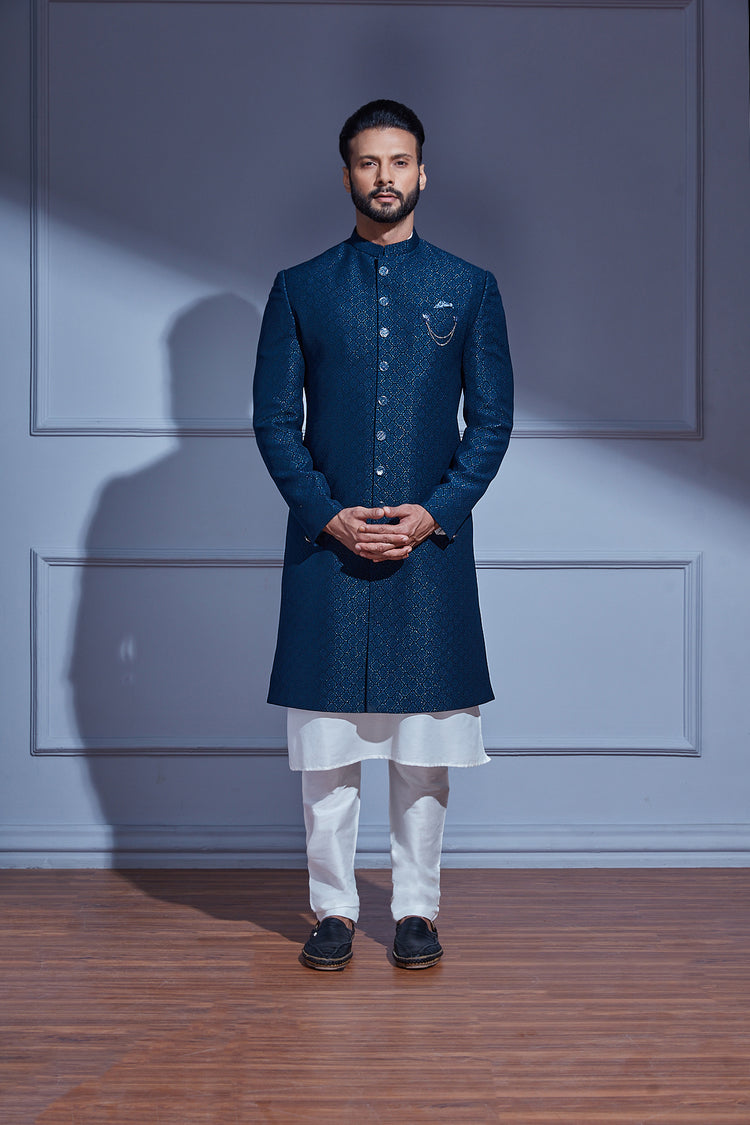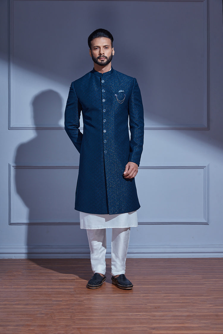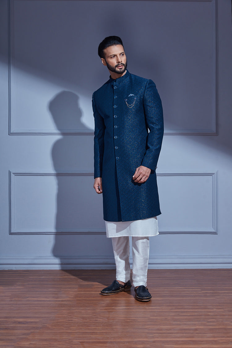 Dress to impress in our Teal Blue Indo-Western Nawabi set, adorned with an all-over fine Sequin work for a touch of sophistication. The Light Cream long Inner Kurta adds a perfect blend of contrast with matching Pajama, making this ensemble a stylish choice for any occasion.