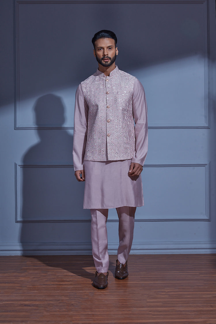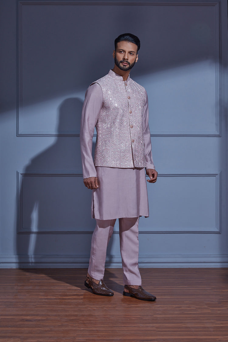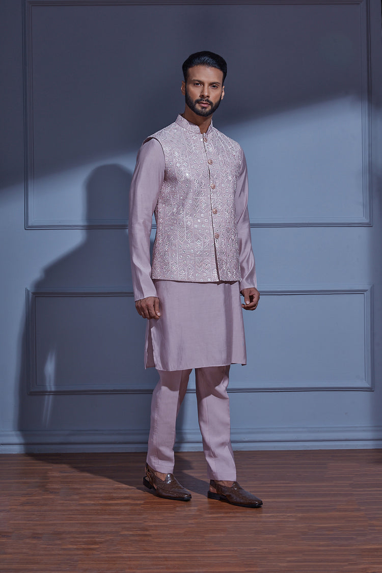 Discover sophistication in our exclusive Flat Purple Pink solid color Jacket Kurta Set, showcasing all-over thread embroidery. This ensemble is enhanced by a matching Solid coloured full-sleeve Kurta and Aligarhi Pants, presenting a distinctive and refined look suitable for any occasion.