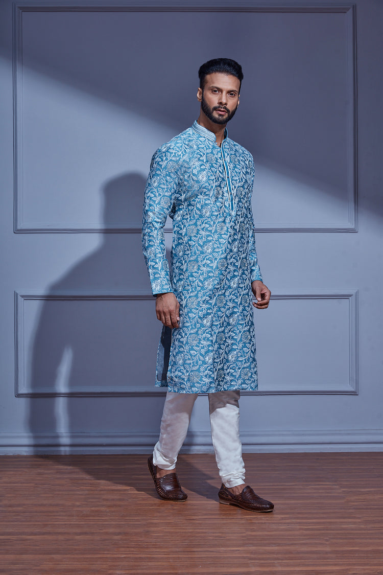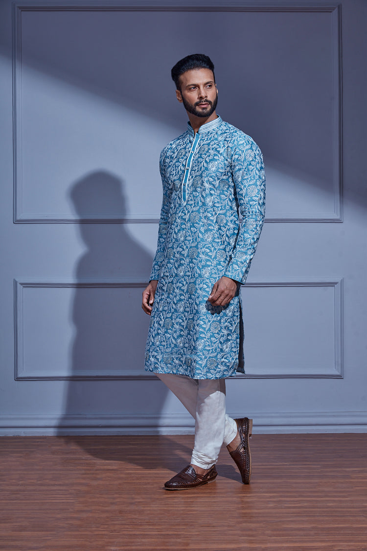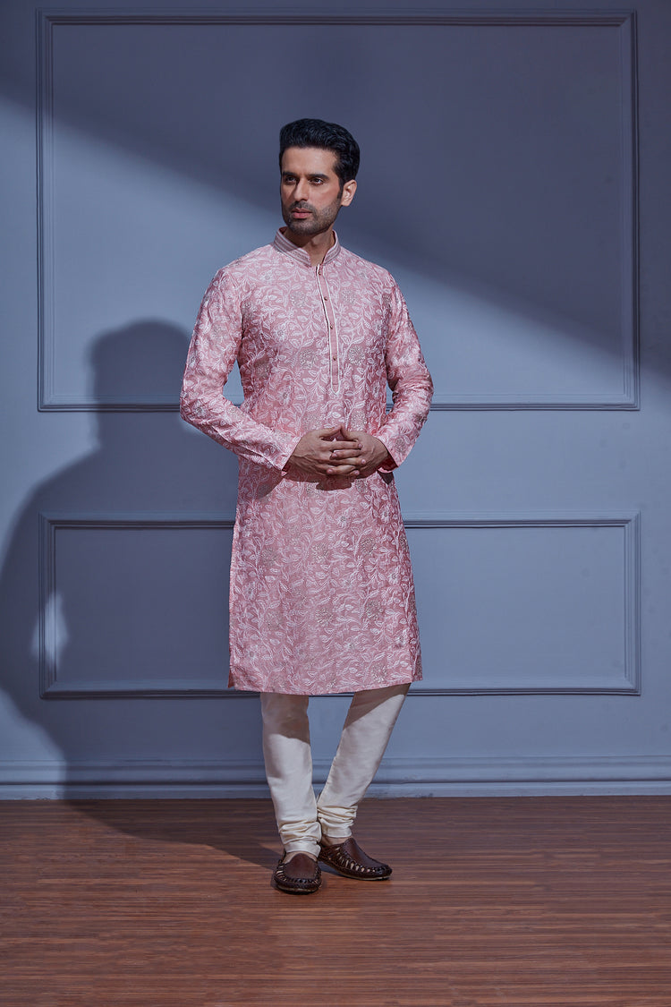 Elevate your style with our Cherry Blossom PINK Kurta Set, adorned with all-over floral thread embroidery on poly-blended fabric. The ensemble exudes sophistication with its fine embroidery on the collar, perfectly paired with a Cream Chudidar for a refined and polished look.