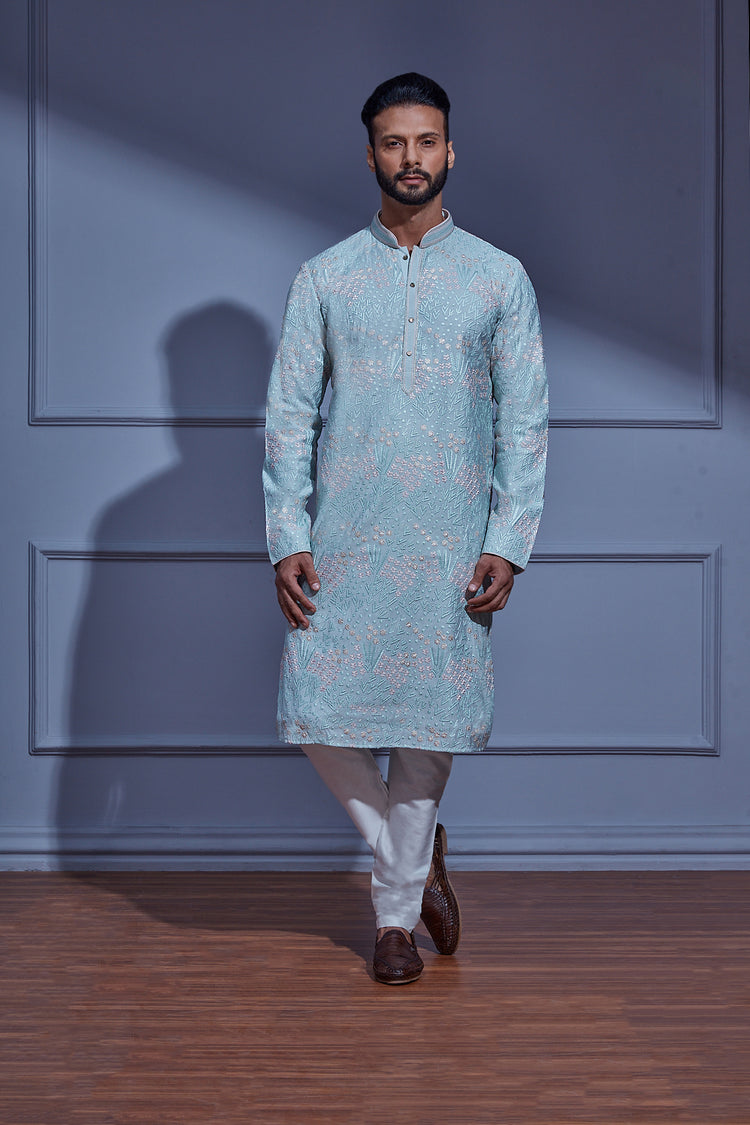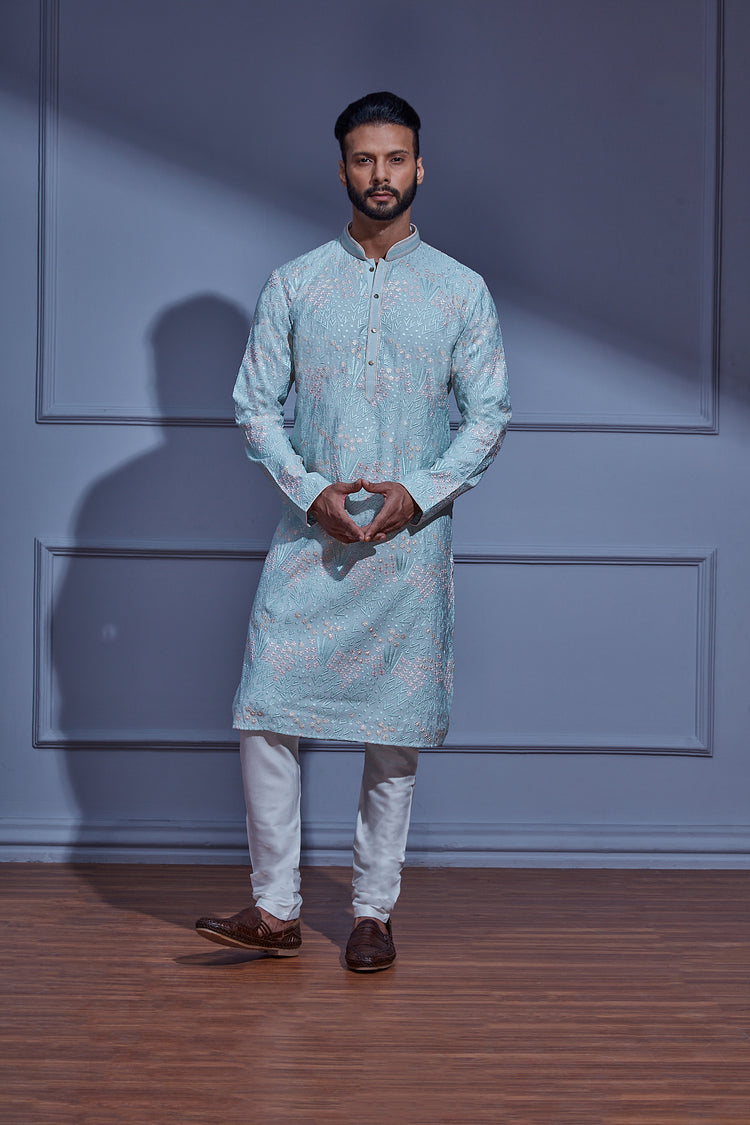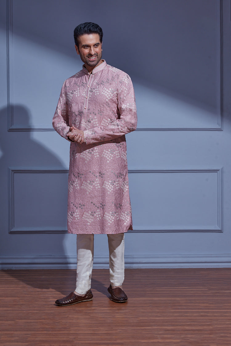 Dress in timeless elegance with our CHERRY BLOSSOM PINK Kurta Set, adorned with all-over thread embroidery and an intricately embroidered collar. Paired effortlessly with a Cream Chudidar.