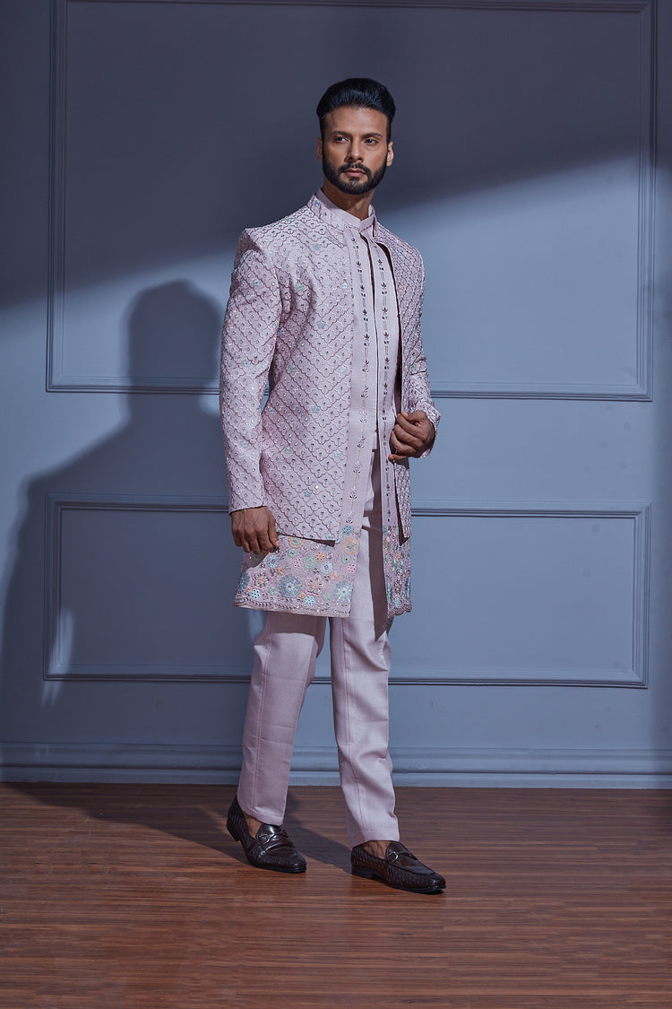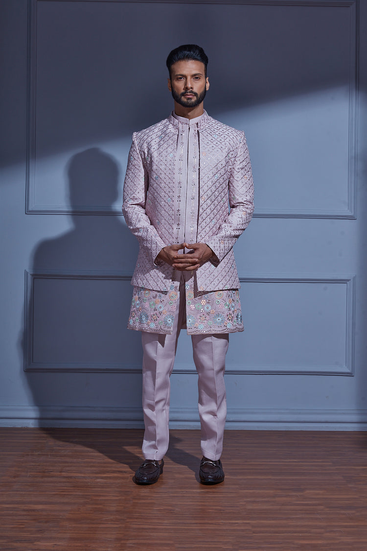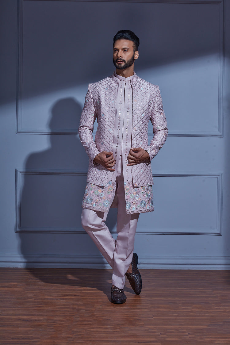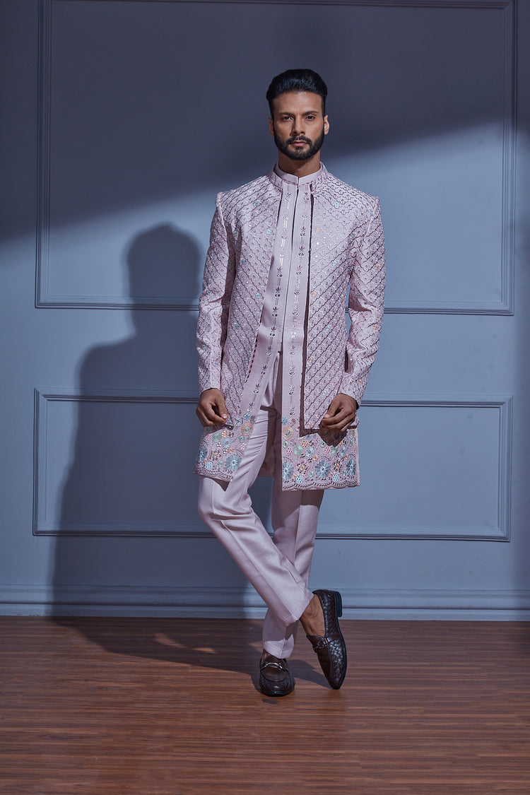 This unique Indo-Western in Onion Pink comes with all over embroidered full sleeve Jacket and Long Inner with elegant floral embroidery at the bottom of it. The ensemble is paired with matching Aligarhi Pants making it stand out on special occasions.