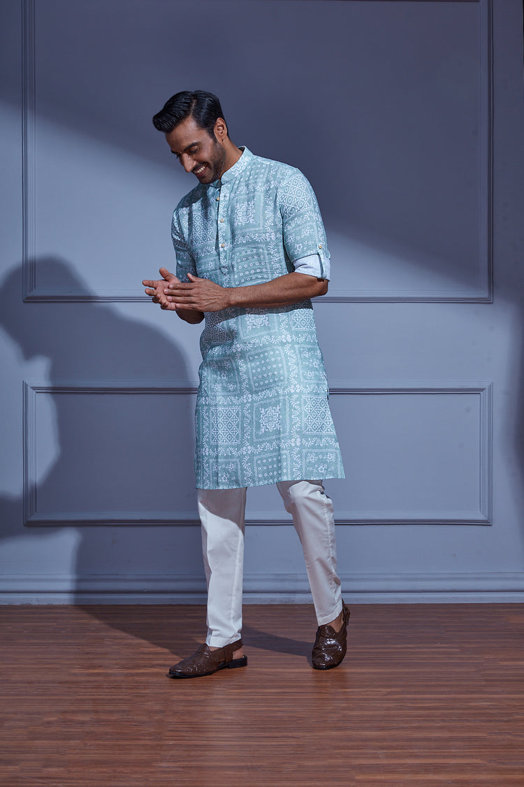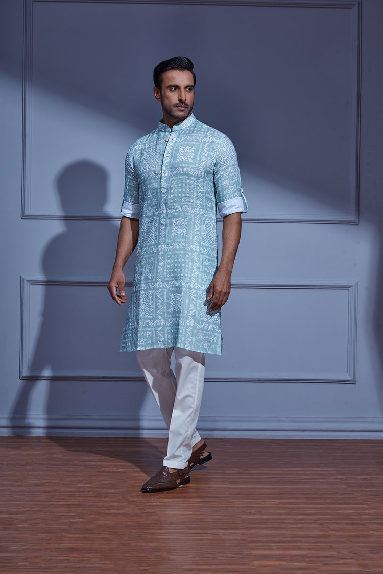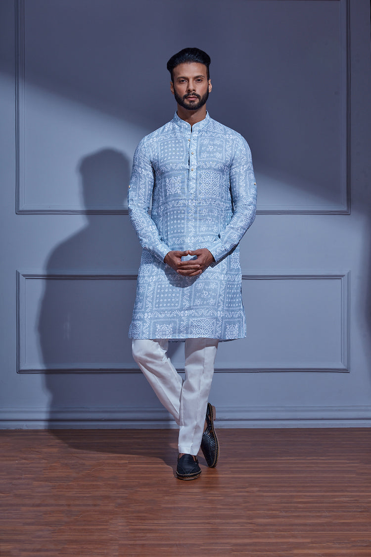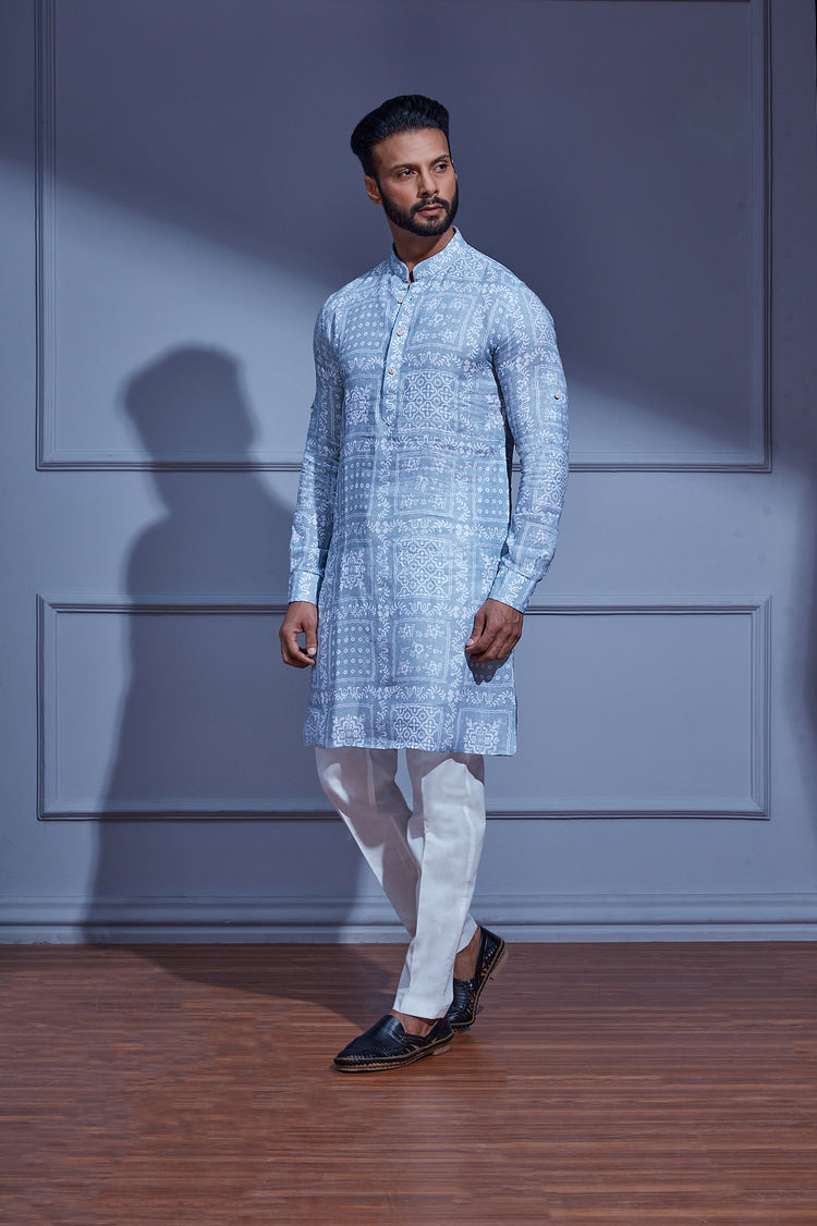 Make a statement in this Faded Blue Linen Kurta Set, carefully designed with distinctive Rangoli-style prints on fine linen fabric. Paired effortlessly with cream-off-white Aligarhi Pants, this ensemble ensures a classic and refined appearance, inviting you to embrace the ideal combination of comfort and style for various occasions.