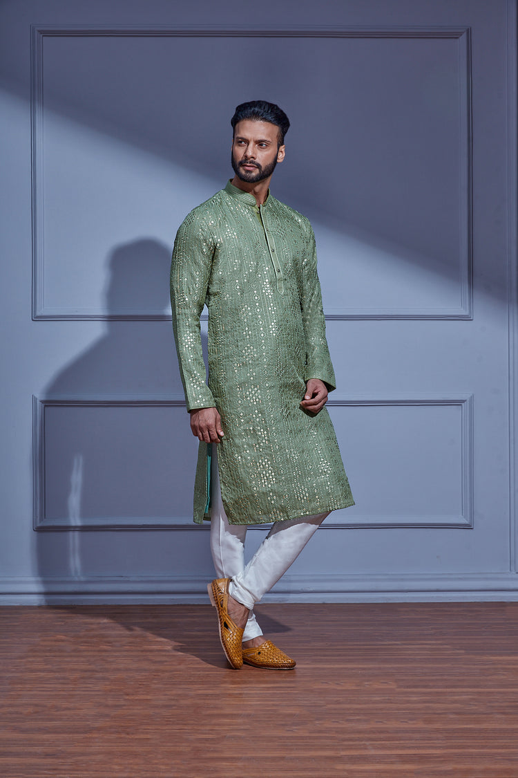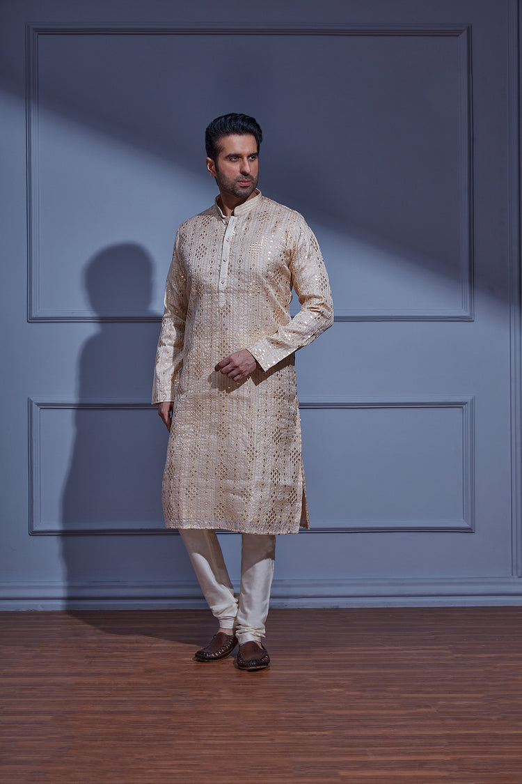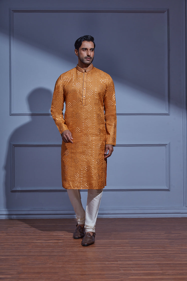 Radiate charm with this Sunshade Mustard Kurta set, featuring mirror-like sequin embroidery on poly-blended fabric. Paired with a Cream Chudidar for a perfect blend of style and sophistication.