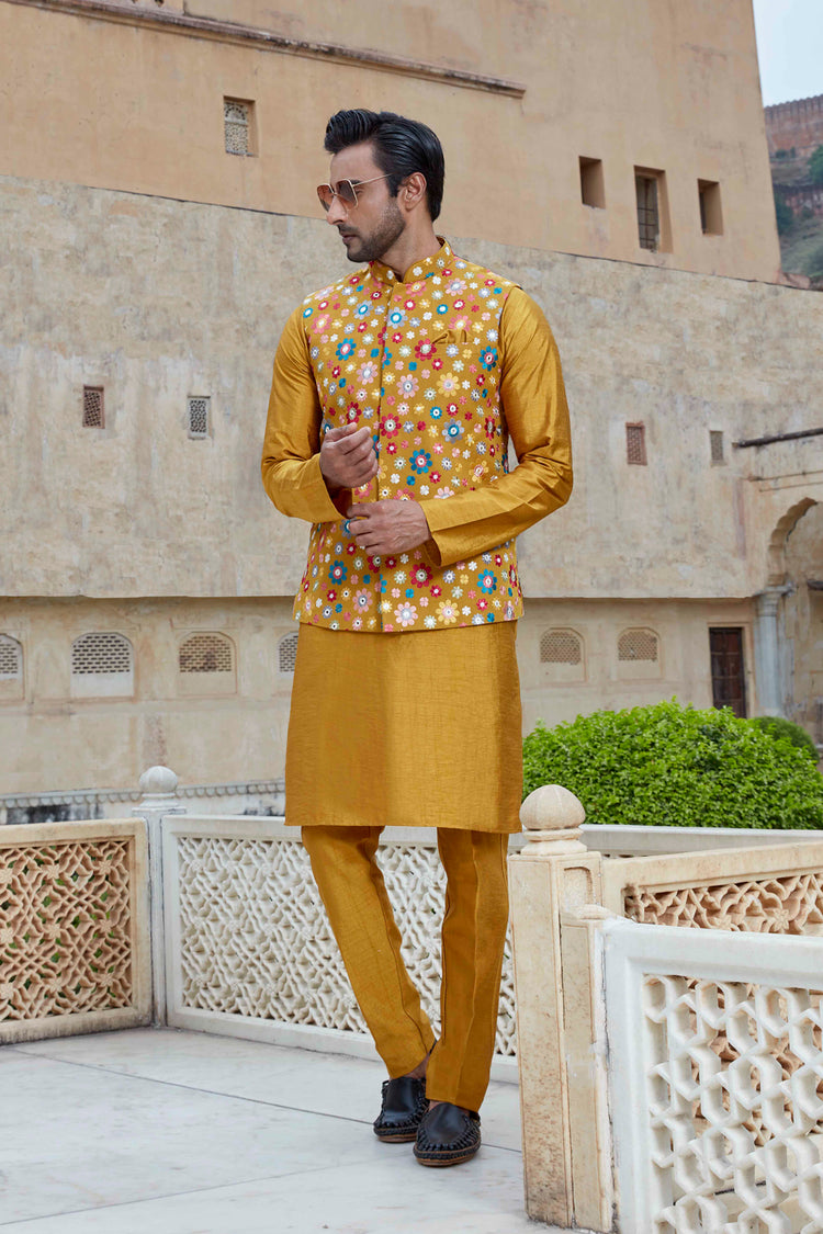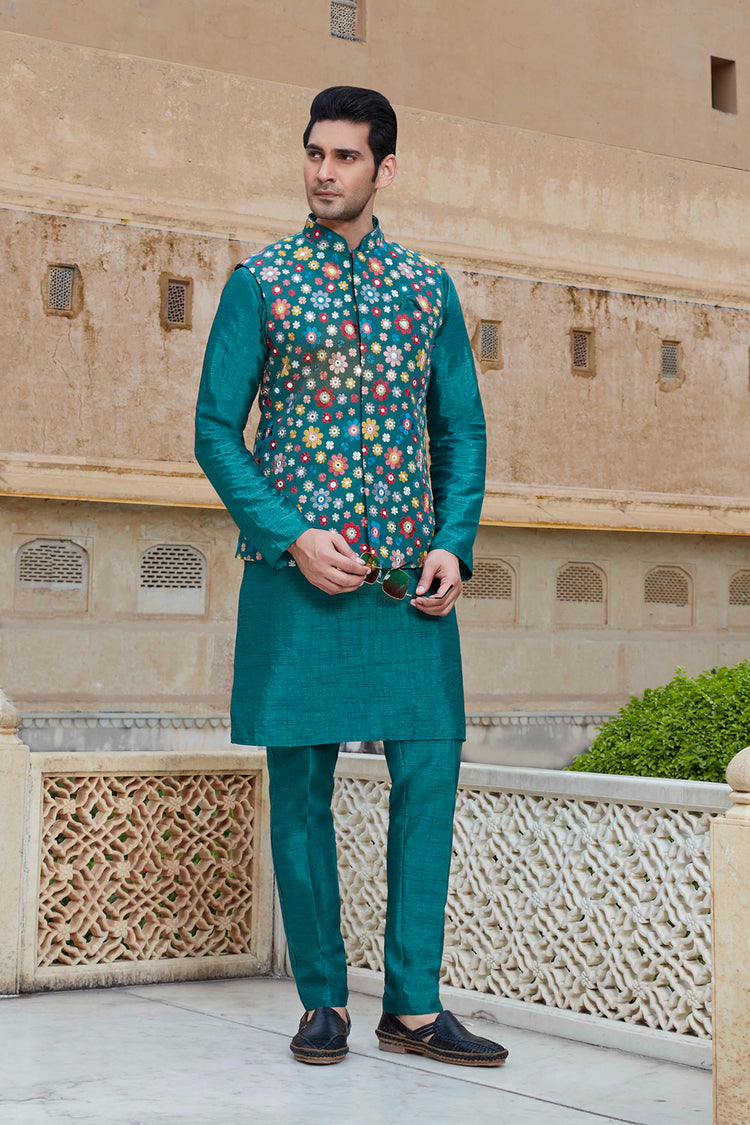 Teal Blue Opal Jacket Kurta set, embellished with exquisite computer embroidered sleeveless Jacket featuring a vibrant floral design, perfectly paired with a matching Kurta and Aligarhi pants for polish look.