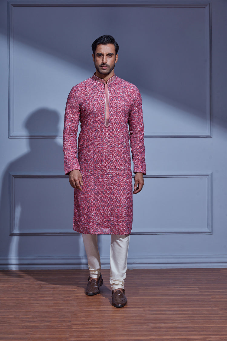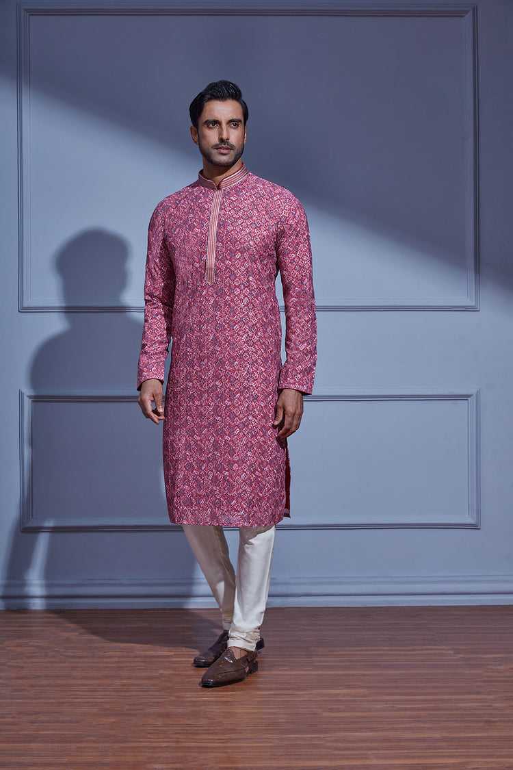 Step into style with our Flamingo Pink Kurta Set, featuring an all-over schiffli print on poly-blended fabric. The ensemble is tastefully accented with linear embroidery on the collar and neckline, creating a fashionable look when paired with Cream Chudidar.