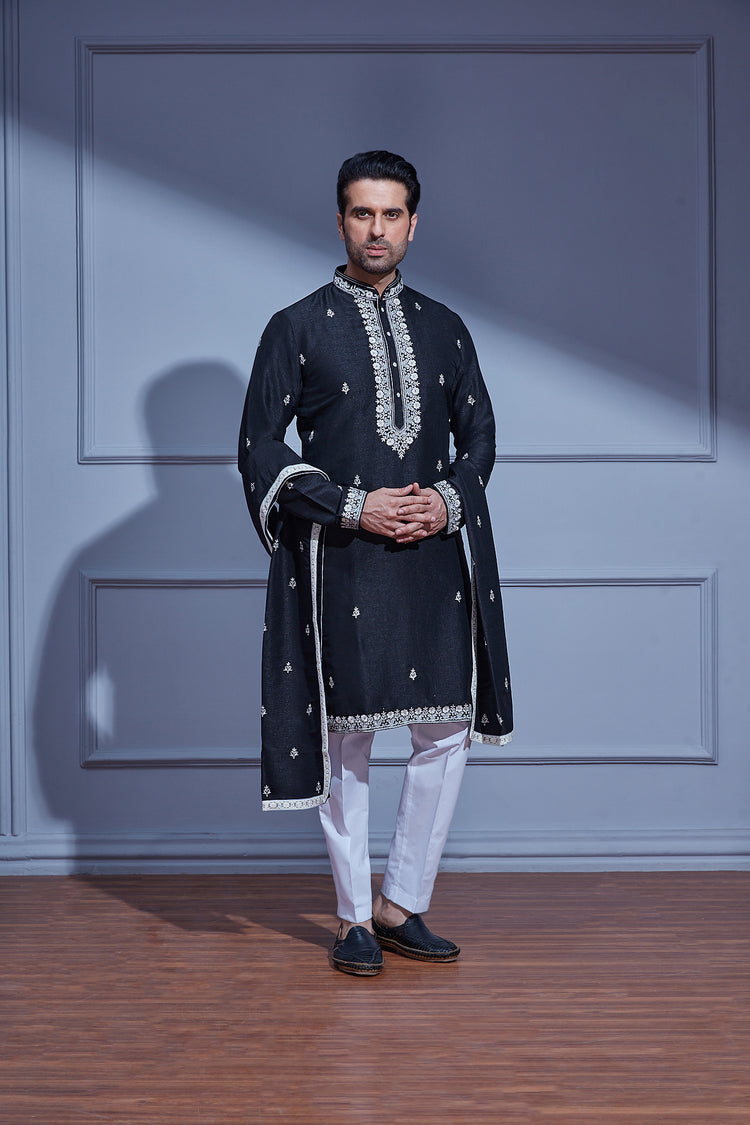 Drape yourself in sophistication with our Dark Grape Purple Kurta set, featuring a Dupatta adorned with all-over floral thread work Butis. The ensemble is further elevated with an exclusive embroidered neckline and borders, perfectly paired with a Cream Chudidar for a refined and elegant look.