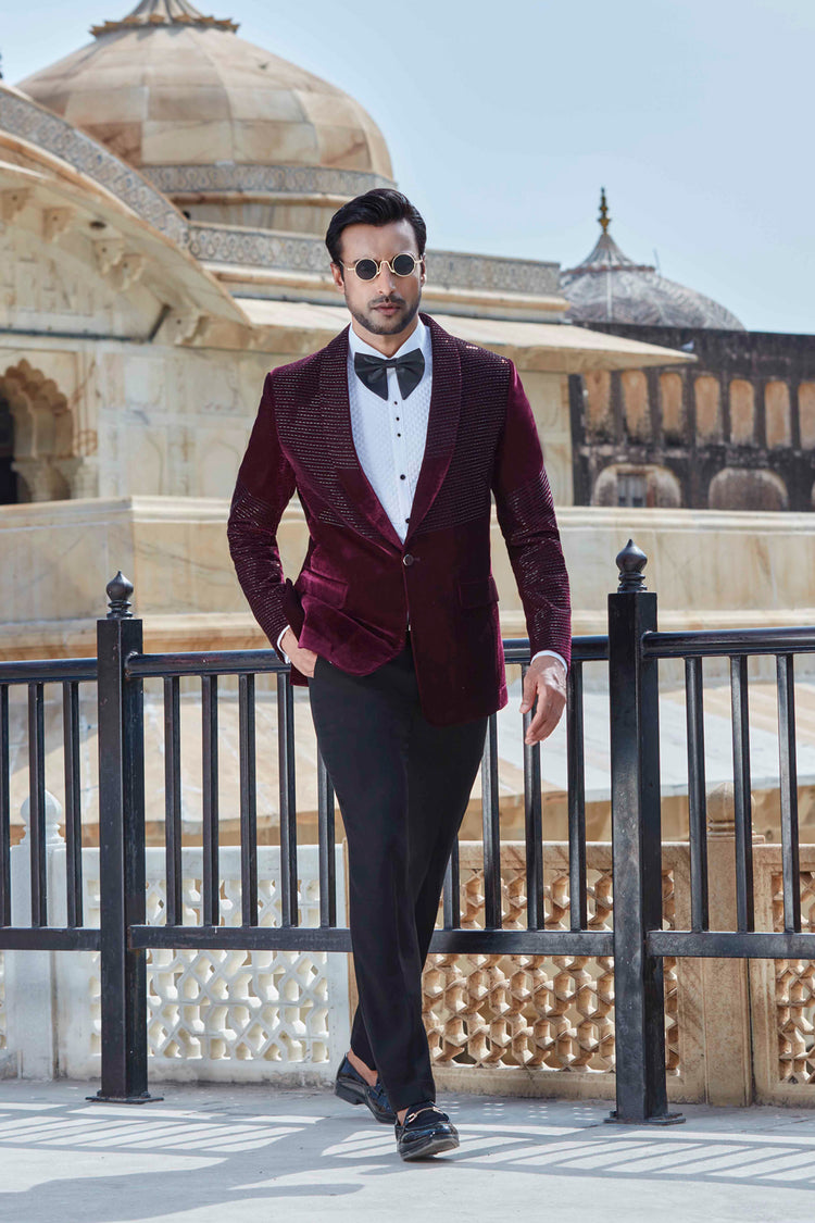This Vine Regal Tuxedo Set well crafted wth embellished Velvet fabric projecting majestic charm. This ensemble Complemented by Charcoal Black Trouser perfect for any special Occasion.