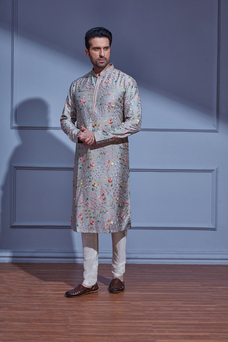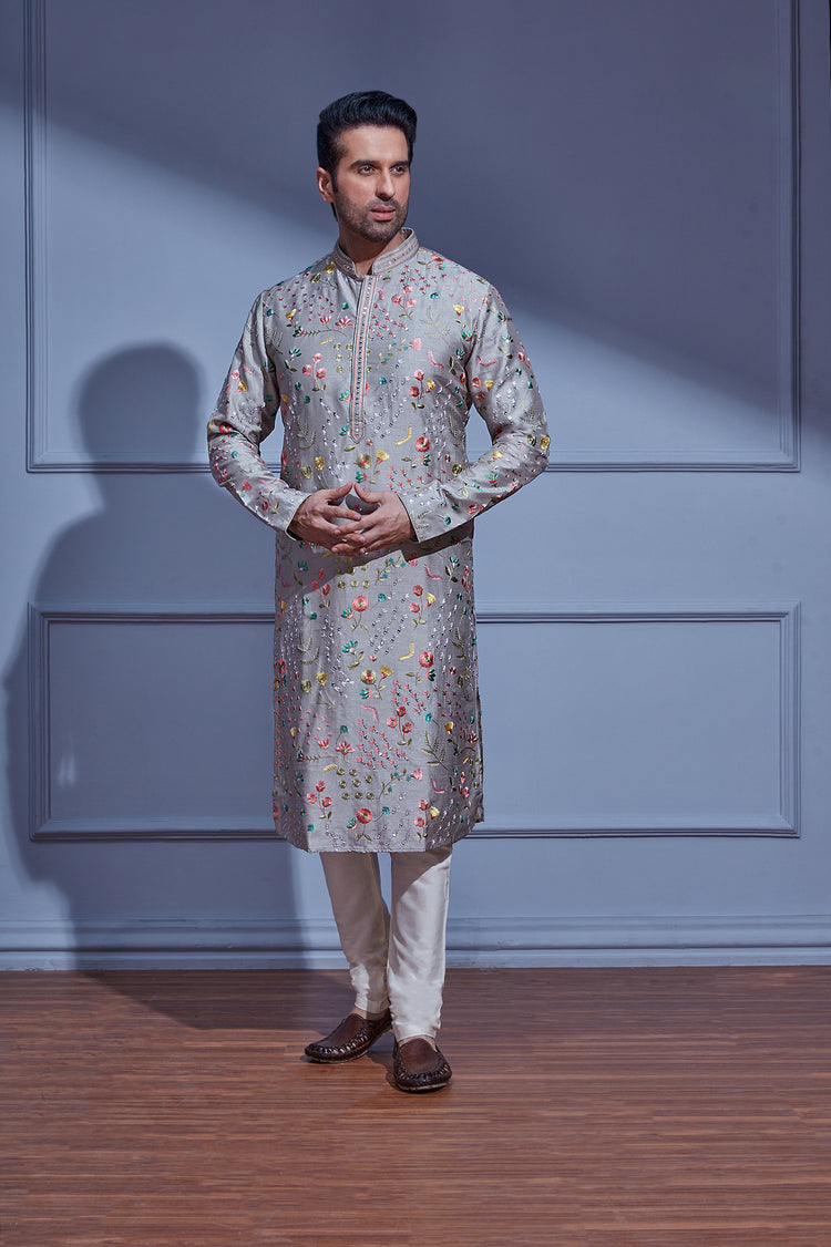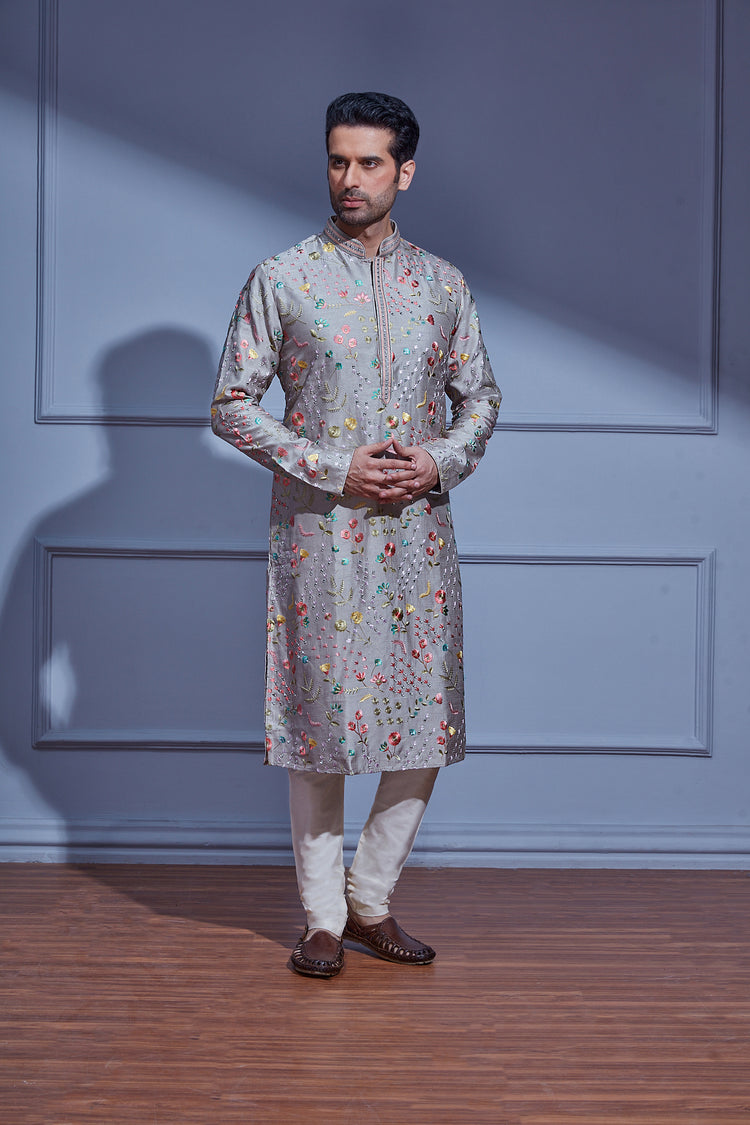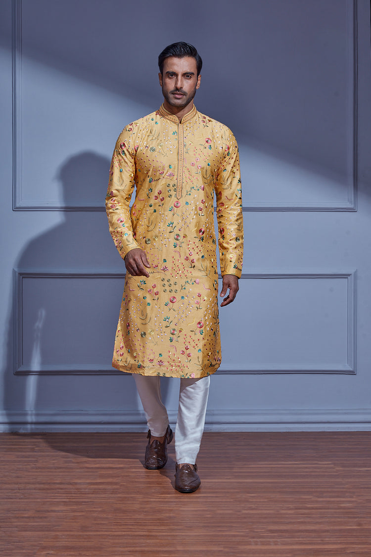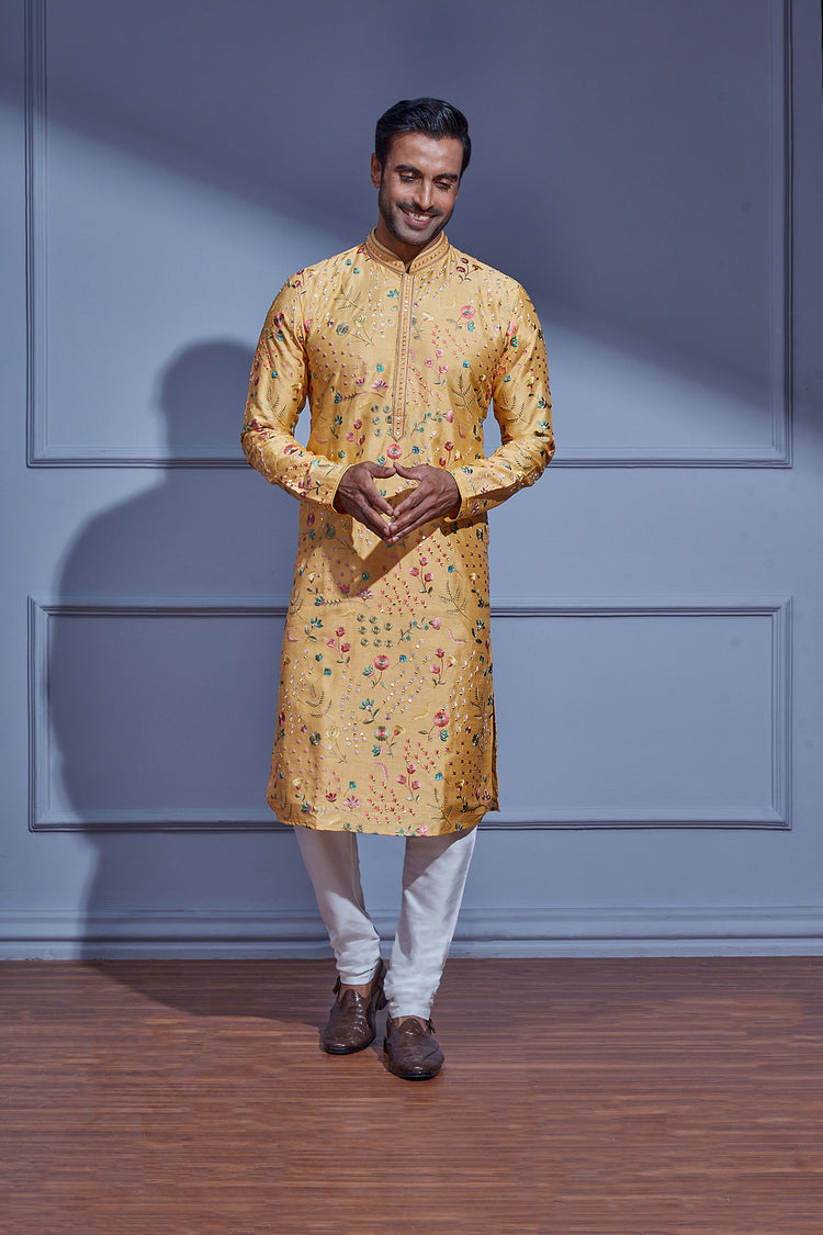 Infuse vibrancy into your wardrobe with our Vibrant Yellow Kurta set, adorned with beautiful all-over floral embroidery on poly-blended fabric. The ensemble is elegantly paired with finely crafted neckline and contrasting Cream Chudidar, creating a striking and refined look for any occasion.